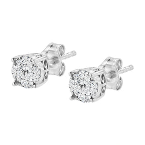 Elegant and timeless, these gorgeous 92. 5% sterling silver cluster stud earrings feature 0. 5 carat total weight of diamonds with 16 individual stones. Four large round brilliant cut diamonds are surrounded with four petite diamonds that fill in the perimeter to make a round cluster composite diamond. This illusion is enforced by the presence of four prominent prongs that look like they are holding one large stone. The earrings feature double notched friction posts with secure butterfly back pushback closures. These classic earrings make a great gift for any special occasion! diamonds are thought to give the wearer clarity and illuminate solutions to life’s problems, as well as encouraging abundance, strength, courage, harmony, faithfulness, and commitment. These stud style earrings are subtle enough for casual affairs but sparkle in formal settings as well. Coordinate these earrings with your favorite diamond necklace or other diamond jewelry to create a complete elegant ensemble.