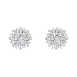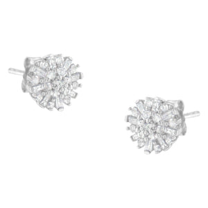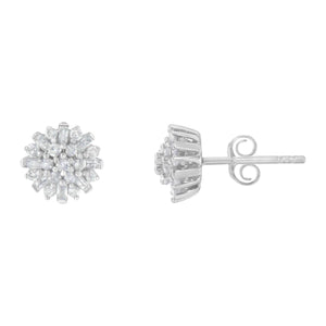 .925 Sterling Silver 1/2 Round and Baguette Diamond Sunburst Floral Cluster Stud Earrings (I-J Color, I3 Clarity)