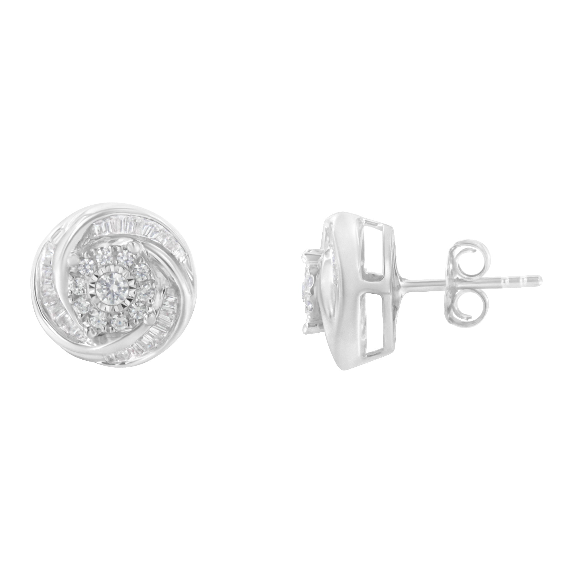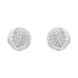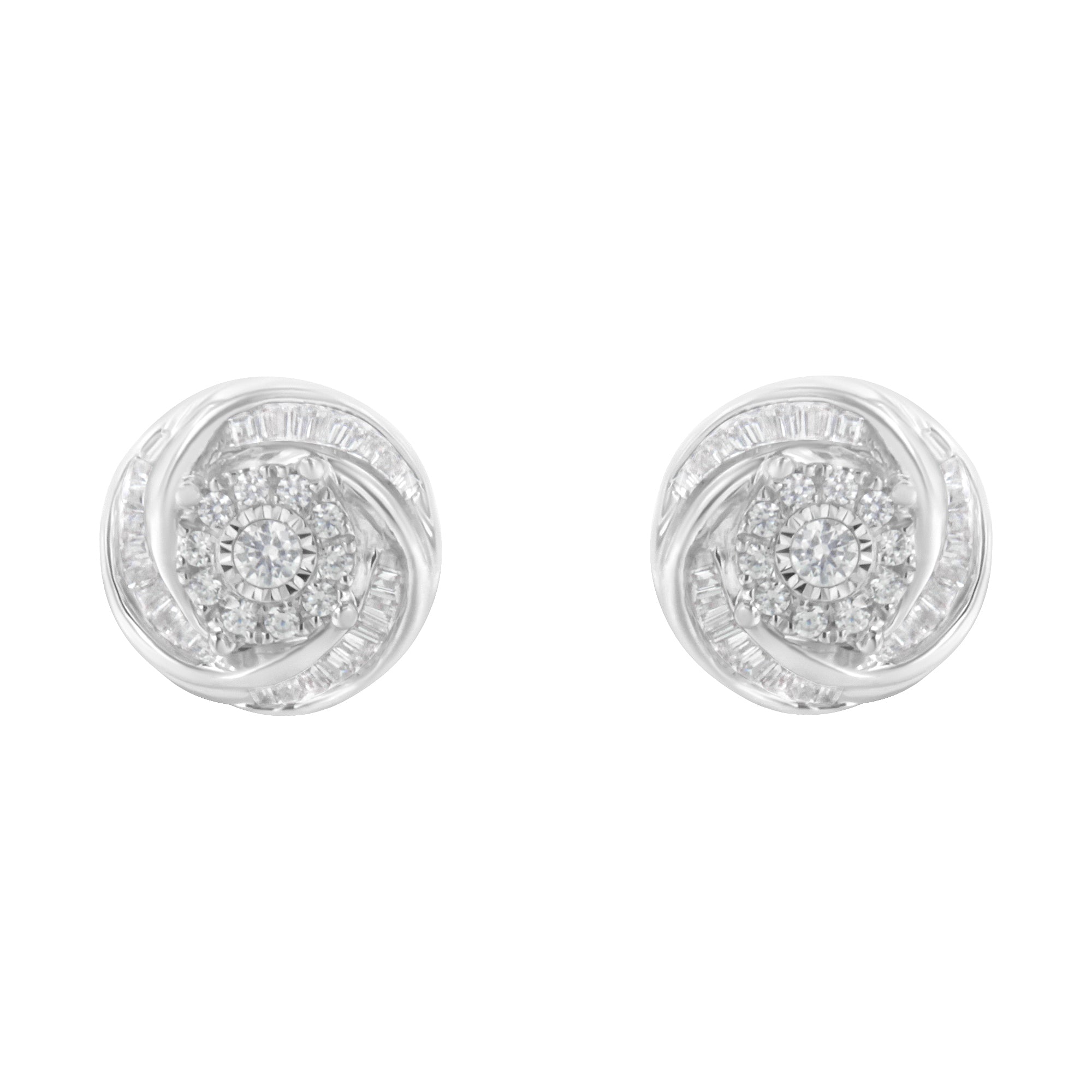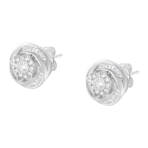 Introducing a dazzling masterpiece that effortlessly captures the essence of love and elegance. Behold these exquisite .925 Sterling Silver Love Knot Stud Earrings, adorned with a mesmerizing array of round and baguette-cut diamonds. Crafted with utmost precision, these earrings feature a total diamond weight of 3/4 carats, comprising of 76 diamonds that radiate a captivating brilliance. The natural diamonds, with their I-J color, sparkle with an enchanting charm. Set in a prong setting, each diamond is meticulously placed to enhance its luminosity. The timeless design of these stud earrings symbolizes eternal love, making them a perfect gift for someone special. With their push back earring findings, these earrings offer both comfort and security. Designed exclusively for women, these earrings are an embodiment of sophistication and grace. Embrace the allure of these Love Knot Stud Earrings and let them become a cherished addition to your jewelry collection.