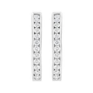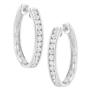 These gorgeous and classic hoop earrings are crafted in the finest. 925 sterling silver and boast an impressive 7/8 ct tdw. The piece is set with lab-grown diamonds that are round-cut and embellished in a channel setting. The diamonds are sustainable and ethical, so you can feel good about the purchase while also admiring the piece's appearance. These earrings come with a latch mechanism for a more secure fit.