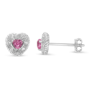 Elegant and timeless, these sterling silver stud earrings feature heart shaped, created birthstones in a miracle plate setting, which centers these stones in a mirror-finish, high-polish frame, giving the illusion of a much larger stone. These earrings come with your choice of either created pink sapphire or created ruby center stones, both of which have been heat treated to enhance their natural color. These stones are haloed by ⅝ carat total weight of diamonds followed by a border of rope texture. The earrings feature pushback closures with notched posts and friction backs. This authentic design is crafted of real 92. 5% sterling silver that has been electro-coated with genuine rhodium (a platinum-family metal), ensuring it will keep a tarnish-free shine for years to come. Diamonds are thought to give the wearer clarity and illuminate solutions to life’s problems, as well as encouraging abundance and commitment. Give her a gift that will perfectly complement her favorite ensemble.