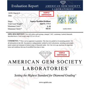 Celebrate any occasion with these classic shimmering diamond stud earrings. Fashioned in 14k yellow gold, each earring showcases a sparkling square shaped, brilliant cut certified diamond solitaire. Dazzling with a bright polished shine, these post earrings secure comfortably with friction posts and butterfly backs. These diamond studs are certified by the ags as natural, earth mined diamonds. This authentic design is crafted of real 14 karat gold, a precious metal that will keep a tarnish-free shine for years to come. These classic earrings make a great gift for any special occasion! whether worn for daytime glamour or evening sparkle, these studs are gorgeously versatile. Coordinate these earrings with your favorite diamond necklace or other diamond jewelry to create a complete elegant ensemble.