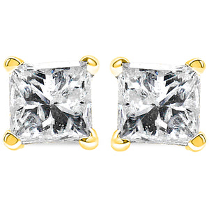 Celebrate any occasion with these classic shimmering diamond stud earrings. Fashioned in 14k yellow gold, each earring showcases a sparkling square shaped, brilliant cut certified diamond solitaire. Dazzling with a bright polished shine, these post earrings secure comfortably with friction posts and butterfly backs. These diamond studs are certified by the ags as natural, earth mined diamonds. This authentic design is crafted of real 14 karat gold, a precious metal that will keep a tarnish-free shine for years to come. These classic earrings make a great gift for any special occasion! whether worn for daytime glamour or evening sparkle, these studs are gorgeously versatile. Coordinate these earrings with your favorite diamond necklace or other diamond jewelry to create a complete elegant ensemble.