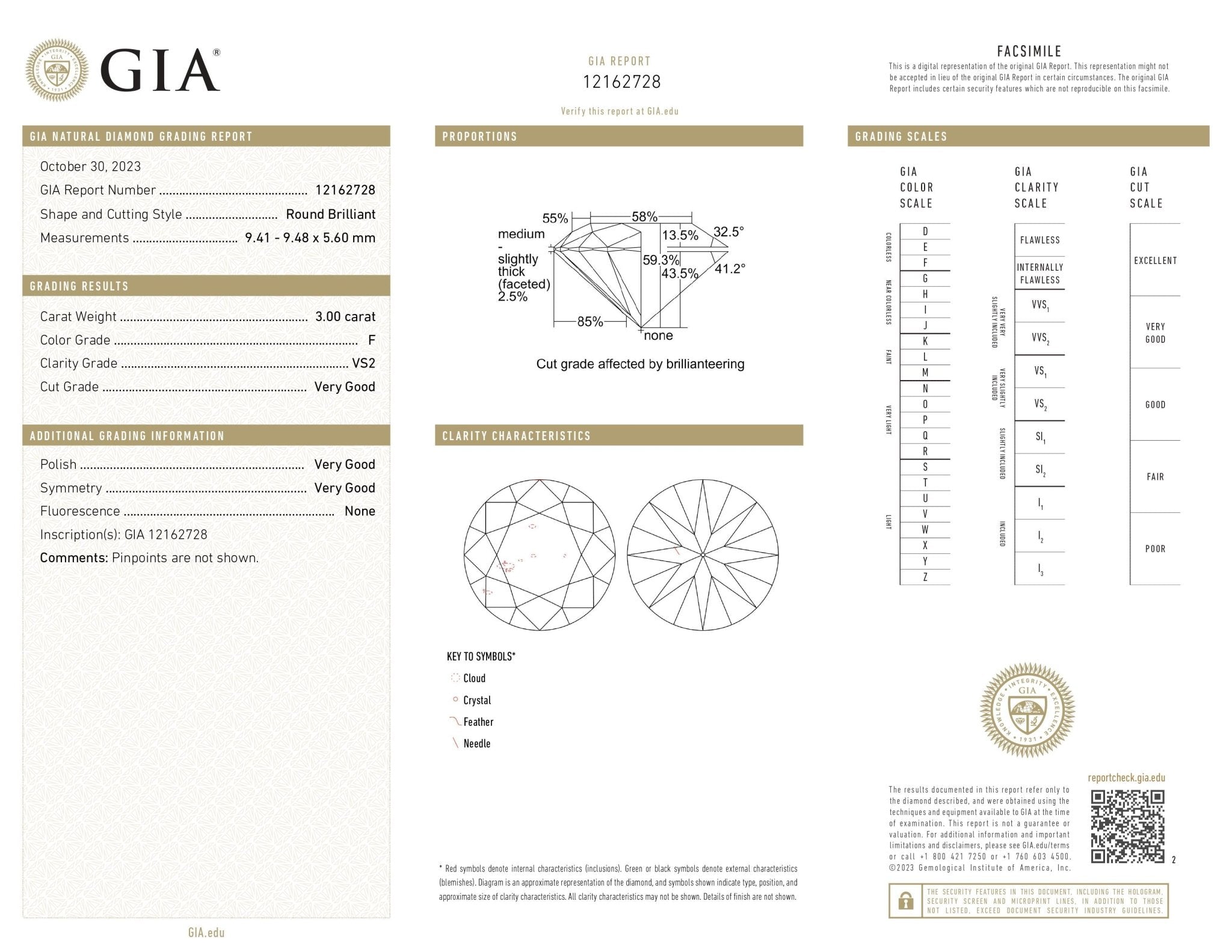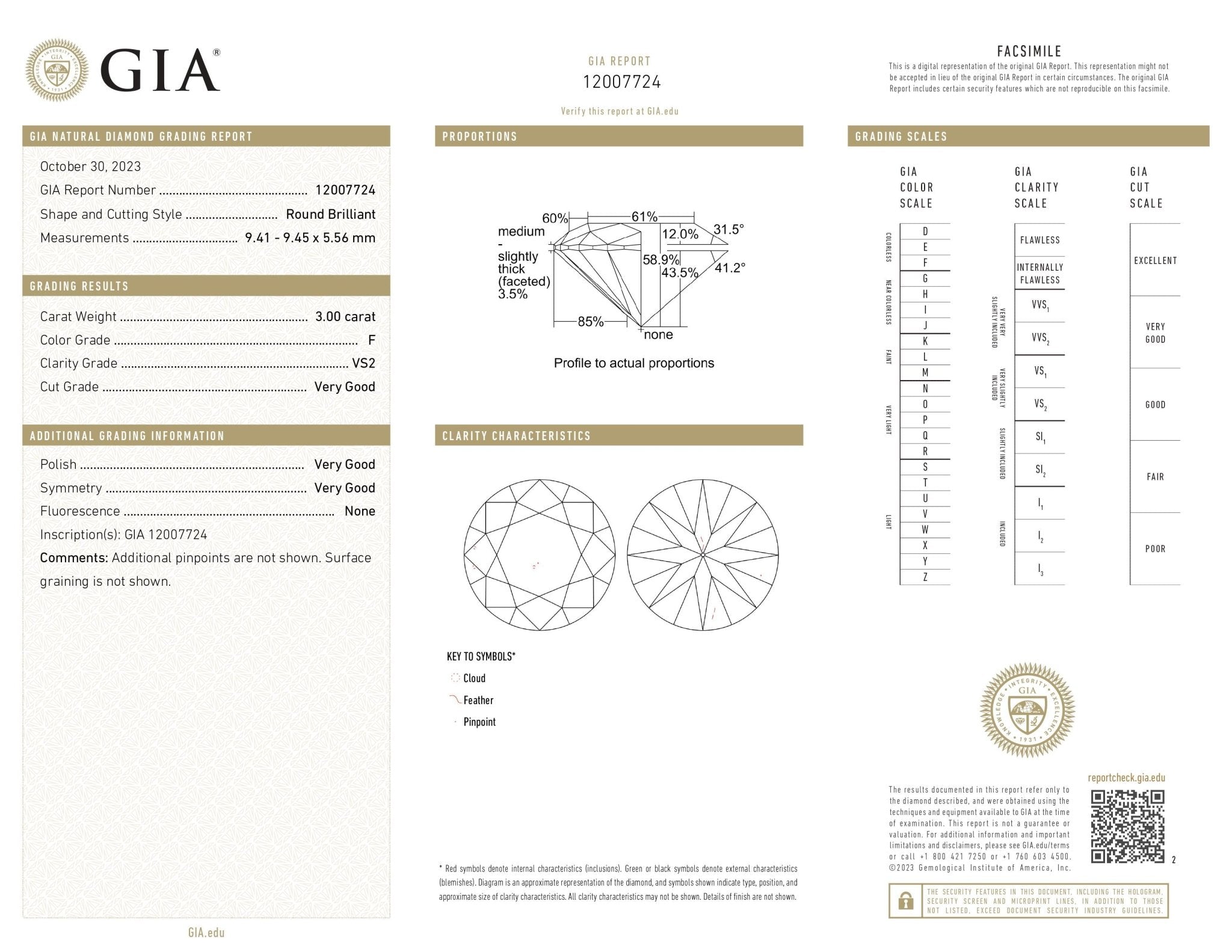 Crafted for the connoisseur of luxury, these exquisite stud earrings exude timeless elegance. Two resplendent, GIA-certified diamonds, each weighing a remarkable 3 carats, are the crowning glory of this pair. These round brilliant-cut gems dazzle with an F color rating, signifying a near-colorless radiance that captures the light in a dance of brilliance. With a VS2 clarity, each diamond is a testament to nature's perfection, showcasing a clarity that is both rare and enchanting. The very good cut, polish, and symmetry of each stone ensure that their scintillating beauty is displayed to its fullest potential. Nestled in a classic 4-prong setting, these jewels epitomize the art of fine jewelry-making. The 14K white gold setting provides a sleek, contemporary canvas that enhances the luminosity of the diamonds. Designed for both security and comfort, the screw back mechanism ensures these treasures remain safely in place, allowing you to move with confidence. These studs are not just accessories; they are a statement of sophistication and grandeur, reflecting the pinnacle of luxury. This pair, valued in the realms of the extraordinary, is more than jewelry - it's a celebration of the rare and the beautiful.