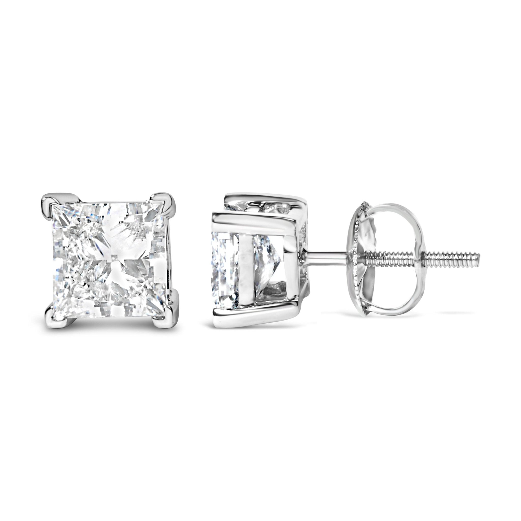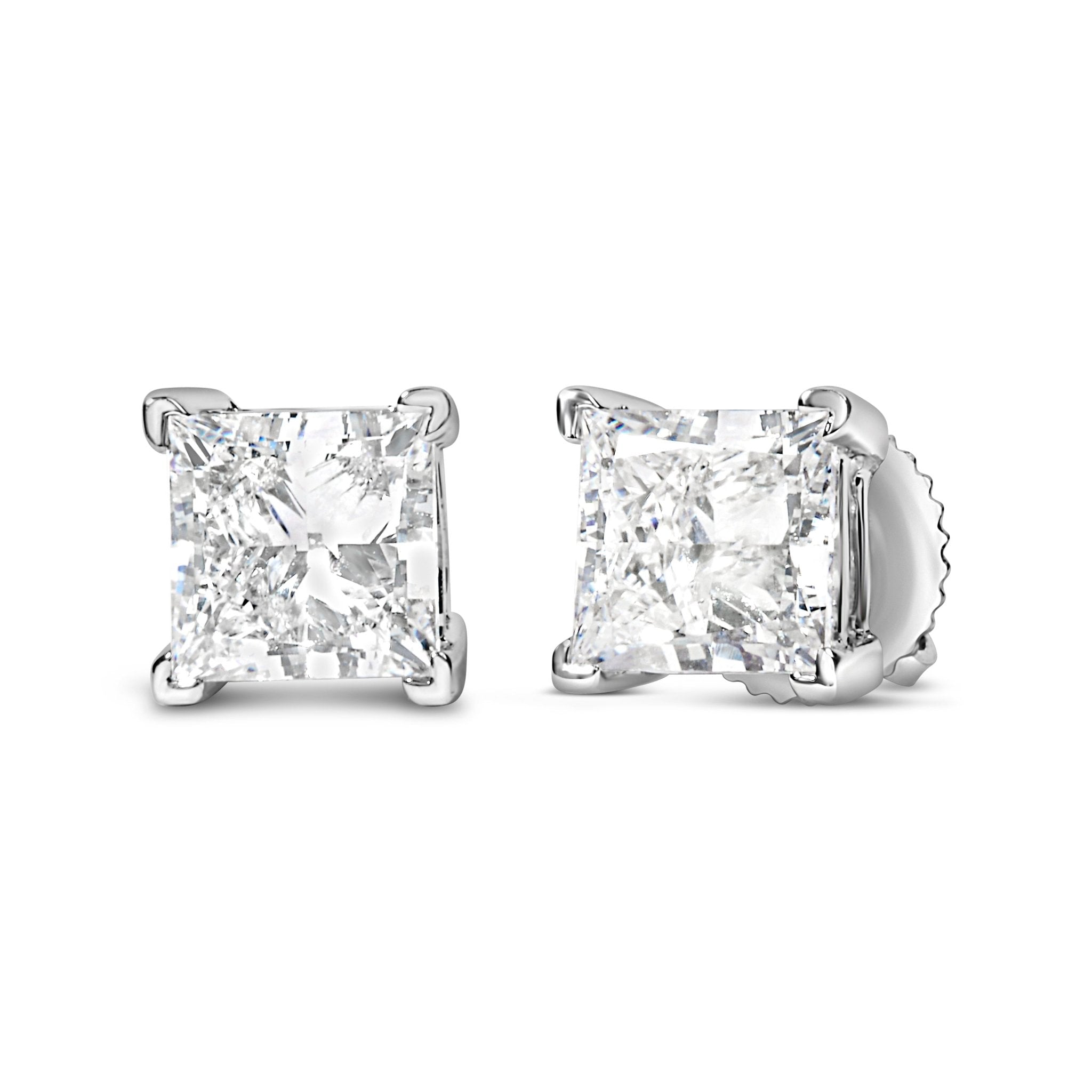 Embrace timeless elegance and modern sophistication with these exquisite 14K white gold solitaire stud earrings. Each earring is meticulously crafted to showcase a dazzling 1/2 carat lab-grown princess cut diamond, offering a total carat weight of 1 for the pair. These stunning gems are celebrated for their F-G color and VS2-SI1 clarity, ensuring a brilliant sparkle that captures the essence of luxury. Expertly set in a secure four-prong setting, these diamonds reflect the pinnacle of craftsmanship and design. The earrings are further enhanced by a rhodium plating over the white gold, giving them a luminous, high-polish finish that accentuates their beauty. Designed for those who appreciate the marriage of innovation and tradition, the earrings come equipped with push backs to ensure a secure and comfortable fit. Perfect for every occasion, from daily wear to the most glamorous events, these earrings promise to be a cherished addition to any jewelry collection, embodying both the allure of diamonds and the prestige of fine jewelry.