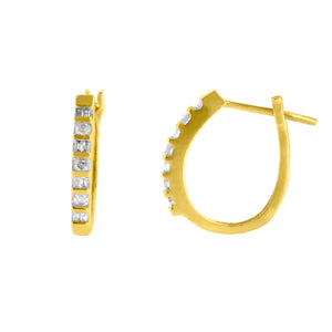 You will fall in love with these unique hoop earrings. A must have for any serious jewelry collection, these 10k gold earrings boast an impressive 0. 25 carat total weight of diamonds with 22 individual stones. The oblong hoops have alternating, channel set rows of baguette cut diamonds and round, brilliant cut diamonds lining the outside face of the hoops. The hoops have hinged, snap-down leverback closures for ease of wear. This authentic design is crafted of your choice of real 10 karat white or yellow gold, a precious metal that will keep a tarnish-free shine for years to come. These bold horseshoe shaped hoop earrings make a great gift for any special occasion! whether worn for daytime glamour or evening sparkle, these earrings are gorgeously versatile. Give her a gift that will perfectly complement her favorite ensemble.