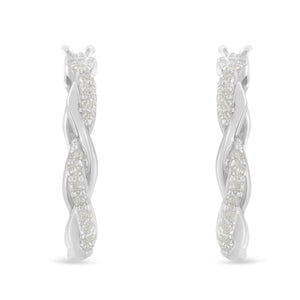 Sophisticated twisted hoop earrings made with the finest. 925 sterling silver and genuine diamonds. These white plated colored earrings include 24 rose-cut shaped diamonds in a pave setting. The diamonds are craved in a layer that interlaces with another plain silver layer. They present one accent diamond weight and come with lever backs for increased comfort. Gorgeous choice for special occasions. The diamonds are rose-cut, promo quality which are on the lowest on the diamond color and quality scale. Rose-cut, promo quality diamonds are milky and cloudy in nature. They have asymmetrical ball shape and are filled with inclusions.