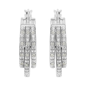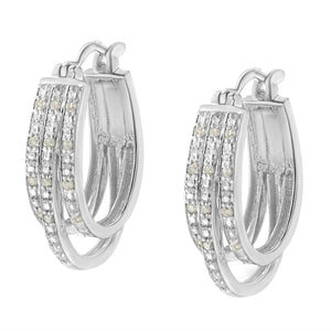 These trendy. 925 sterling silver earrings feature a unique design. Two small hoops sit on each side of a larger one. All hoops are inlaid with 1/4ct rose cut, promo quality diamonds. A lever back mechanism keeps the earrings secure. Promo quality diamonds are on the lowest of diamond color and quality scale. Round-cut, promo quality diamonds are milky and cloudy in nature. They have asymmetrical ball shape and are filled with inclusions.