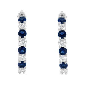 Elegant and classic, these stunning hoop earrings are fashioned in 10k white gold. Sparkling 1/2ct tdw of round cut diamonds alternate with 2. 5mm, lab created, round blue sapphires and inlay the front of the hoop. A lever back mechanism keeps the earrings secure.