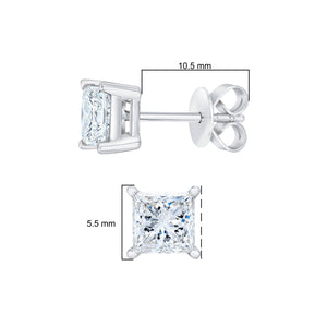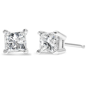 Celebrate any occasion with these classic shimmering diamond stud earrings. Crafted from 14k White Gold each earring showcases a sparkling Princess-Cut Solitaire Diamond in a 4-Prong Setting. Dazzling with 1 Cttw of diamonds and a bright polished shine, these Push Back stud earrings secure comfortably on your ear. These diamond studs are certified by the AGS as natural, earth mined diamonds. These diamonds are color rated as E-F Color, and clarity graded as I1-I2 Clarity. Make these classic diamond studs yours today. Comes as a pair. Each earring piece has a 1/2 cttw diamond and the total weight for this diamond stud pair is 1.0 Cttw