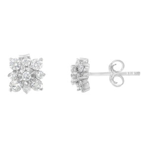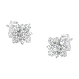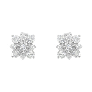 A intricate pair of diamond floral stud earrings featuring a central round brilliant cut diamond surrounded by further diamonds creating a feminine design. Crafted in cool sterling silver, the total diamond weight is 1/2 carat.
