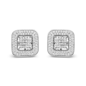 Discover the exquisite symmetry and breathtaking sparkle of these rhodium-plated 10K white gold stud earrings, where luxury meets timeless elegance. At the center of each earring, 16 masterfully set princess-cut diamonds converge to mimic a grand solitaire, their natural origin ensuring a purity of form that catches the light with every turn. Encircled by a delicate halo of brilliant round diamonds, a whisper-thin open space introduces an alluring depth that makes the central mosaic pop with an arresting clarity and color graded H-I, SI1-SI2. These studs not only accessorize an outfit but elevate it, promising to bring a touch of sophistication to any occasion and a lifetime of admiring glances. Earring secure with screw backs.