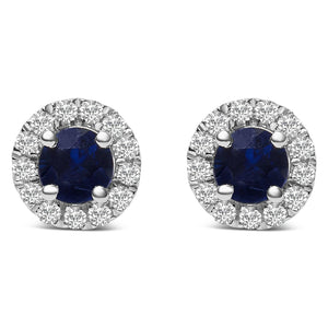 Indulge in the symphony of light and color with these exquisite 10K white gold earrings, beautifully highlighted by the natural allure of deep blue sapphires, naturally sourced, and meticulously crafted without any treatment, ensuring their pristine and authentic beauty shines through. Each earring centers a luscious 3.25mm blue sapphire, encircled by a radiant halo of natural diamonds, collectively weighing 1/10 carat, boasting an I-J color and I1-I2 clarity. This enchanting constellation is designed to mimic a grander solitaire, casting a spherical illusion that magnifies its mesmerizing impact. The durable rhodium plating enhances the white goldâs brilliance, ensuring lasting gleam and sophistication. Secure pushbacks provide peace of mind for these treasures of refined elegance, destined to elevate any ensemble, captivate onlookers, and resonate with the wearer's refined taste.