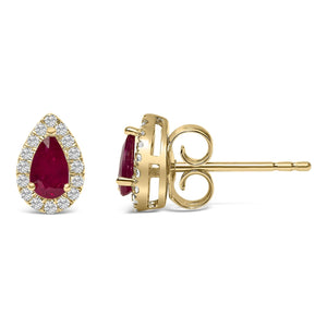 Drape your ears in the opulence of these 10K yellow gold stud earrings, each centered with a mesmerizing 5x3 mm pear-cut natural ruby. Untreated for authenticity, the ruby's deep red hue radiates with timeless elegance, enhanced by a halo of glittering natural diamonds totaling 1/7 carat. These diamonds, with I-J color and I1-I2 clarity, form a dazzling frame, their brilliance accentuated by the luxurious yellow gold setting. The unique pear shape of these earrings mirrors the gemstone's silhouette, creating a sophisticated cohesion in design. Securely fastened with push back closures, these earrings promise both comfort and style, making them a perfect accessory for lending a touch of glamour to any ensemble or a treasured gift for someone special.