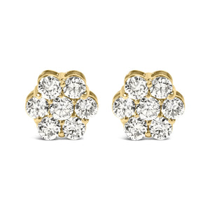 Immerse yourself in the elegance of these sumptuous 14K yellow gold stud earrings, where fourteen natural diamonds, totaling 1 1/2 carats, converge in a radiant display of floral brilliance. Each stud blooms with seven round brilliant cut diamonds, intricately shared prong set to mimic the grandeur of a singular, larger solitaire. This masterful illusion enhances their scintillating allure, with each gem casting playful reflections of light in I-J color and SI1-SI2 clarity, promising both sparkle and sophistication. The secure screw backs offer not only comfort but a promise of lasting beauty, ensuring these treasures remain a cherished part of your collection. Perfect for those who appreciate a touch of nature's artistry, these earrings symbolize luxury and grace, seamlessly blending with every ensemble from day-to-night.