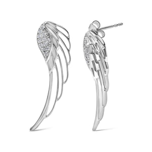 Illuminate your visage with the ethereal elegance of these 14K white gold earrings, each piece masterfully rhodium-plated to enhance the luminous sheen. Molded into delicate angel wings, these studs are meticulously adorned with lab-grown diamonds, boasting an F-G color and VS1-VS2 clarity, ensuring each glance towards them captures an unmatched sparkle. Approximately 1 1/3 inches in length, they gracefully extend below the ear, secured by a reliable push-back closure for enduring comfort. These exquisite earrings, symbols of purity and protection, promise to be a celestial addition to your jewelry collection, resonating with the sophisticated allure of modern craftsmanship and sustainable beauty.