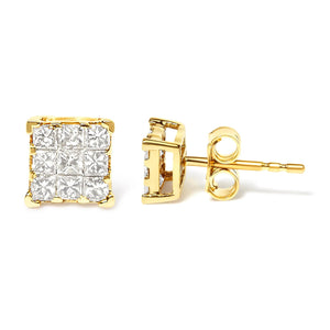 Discover the understated elegance of these exquisite stud earrings, crafted from radiant 14K yellow gold and highlighted by the brilliance of natural princess-cut diamonds. Each earring showcases a cluster of nine diamonds, totaling half a carat, set invisibly to present the illustrious appearance of a single, expansive stone. With a subtle J-K color and SI2-I1 clarity, these gems catch and reflect light with every turn, casting a glow of sophistication and class. The secure push-back closures provide peace of mind, ensuring these treasures sit snugly against your ears. Perfect for every occasion, these earrings are a testament to the allure of fine craftsmanship, blending timeless charm with contemporary elegance to adorn your ensemble with a touch of luxury.