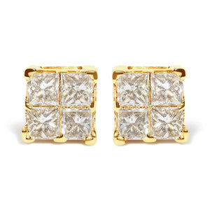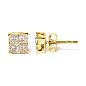 Immerse yourself in the timeless elegance of these square stud earrings, meticulously crafted from radiant 14K yellow gold. Each piece shines brightly with four natural princess-cut diamonds, ingeniously set to mimic a larger solitaire's grandeur through an impeccable invisible setting. With a total diamond weight of 3/4 carats, the jewels sparkle with a subtle warmth characterized by J-K color and SI2-I1 clarity, reflections of natural beauty and artisanal precision. Securely fitted with push backs, these earrings promise both comfort and style, becoming an indispensable treasure in your jewelry collection. Embrace the blend of sophistication and clever design, a testament to refined tastes.