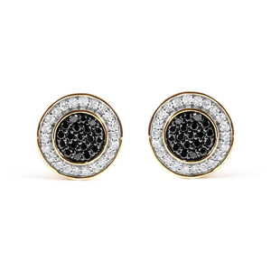 Indulge in the luxurious sparkle of these stunning diamond earrings. Crafted from the finest 14K yellow gold plated .925 sterling silver, these earrings boast a total of 82 dazzling diamonds. The unique combination of 38 black treated and 44 white diamonds adds a bold and striking contrast to these earrings, making them perfect for any fashion-forward man. The diamonds boast a total weight of 1/3 carat and are of I-J color and I2-I3 clarity, ensuring a radiant and eye-catching shine. With a classic and timeless stud design and a secure push back finding, these earrings are the perfect addition to any jewelry collection. Upgrade your style and add a touch of elegance to any outfit with these must-have diamond earrings.