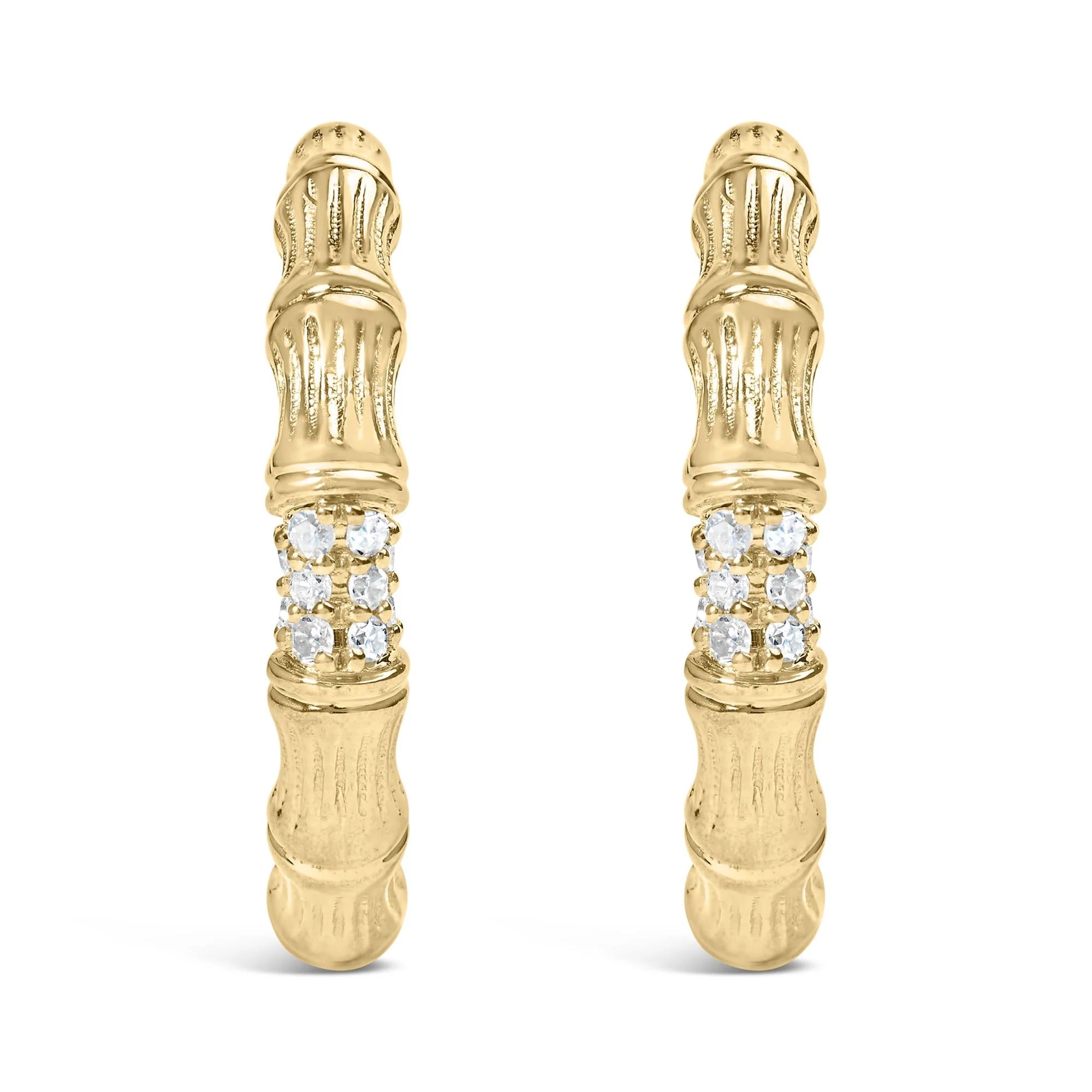 Introducing the quintessence of luxury and artistry, our Hammered J Hoop Earrings, painstakingly crafted from .925 sterling silver and lavishly adorned with a 14K yellow gold plating. These exquisite hoops dangle enchantingly, about 1 inch from the earlobes, and measure 3 mm in width, effortlessly balancing subtlety with statement. Each earring showcases a distinct hammered finish, offering a textured look that captivates and catches the light with every movement. Secured comfortably with a pushback mechanism, these earrings are not only a pleasure to wear but also steadfast in their elegance. Adding a sprinkle of splendor, the earrings are studded with natural diamonds, totaling 1/6 carat, exuding pure brilliance in H-I color and I1-I2 clarity.