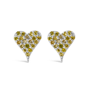 Envelop your lobes in the luminescent embrace of these exquisite heart-shaped stud earrings, meticulously crafted from 925 sterling silver and kissed with a rhodium plating for that extra shimmer and resilience. At the heart of each piece are natural, earth-mined yellow diamonds, delicately treated to exude a vibrant, sun-kissed hue that captures the very essence of joy and positivity. These gems, though bearing an I3 clarity, come together in a close-knit arrangement, their collective sparkle defying individual imperfections to create a dazzling spectacle of light. The earrings' secure push back mechanism ensures they sit comfortably at your ears, making them an ideal adornment for both everyday elegance and special moments.