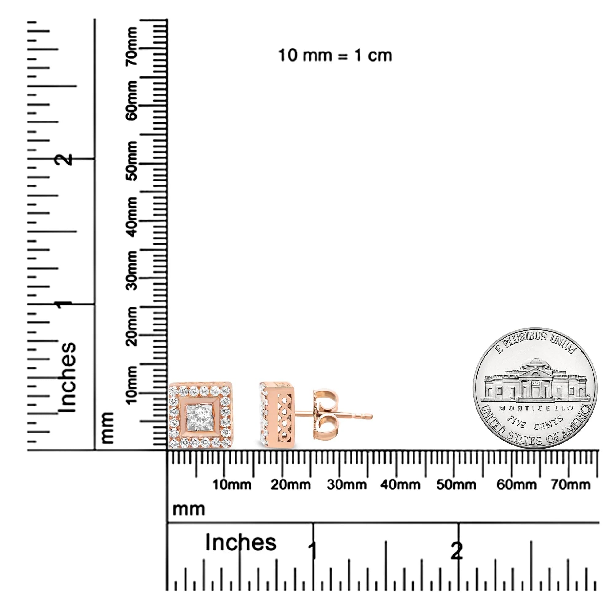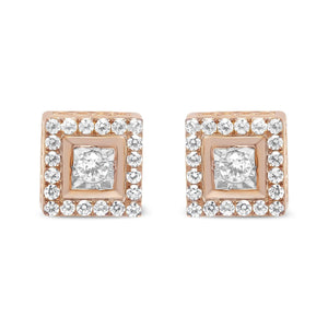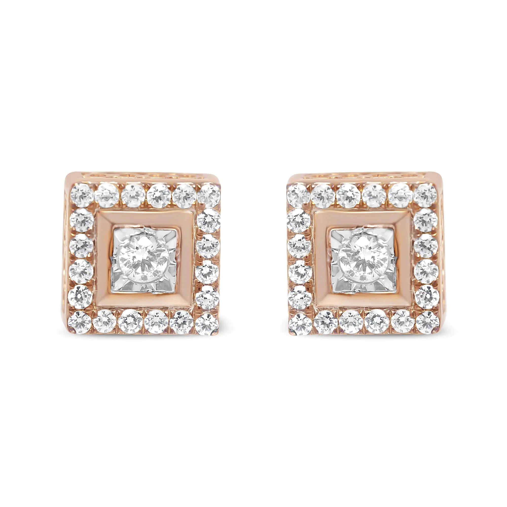 Indulge in the sumptuous elegance of these sterling silver earrings, lovingly plated in 14K rose gold and adorned with a constellation of natural diamonds that collectively weigh a breathtaking 1/2 carat. At the heart of each stud lies a mesmerizing 1/15 ct. diamond, set to captivate and reflect every flicker of light, magnifying its inherent luminescence. Encasing each central jewel is a meticulously crafted square frame, studded with a halo of smaller diamonds that amplify the centerpiece's splendor, creating an endless dance of light with every turn of your head. These treasures secure gracefully with friction backs, offering not just comfort but the peace of mind that your precious adornments will remain snugly in place. Perfect for elevating everyday wear or adding a touch of glamour to evening ensembles, these earrings promise to be a perennial favorite in your jewelry collection.