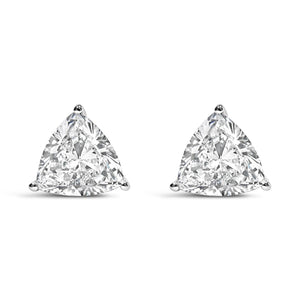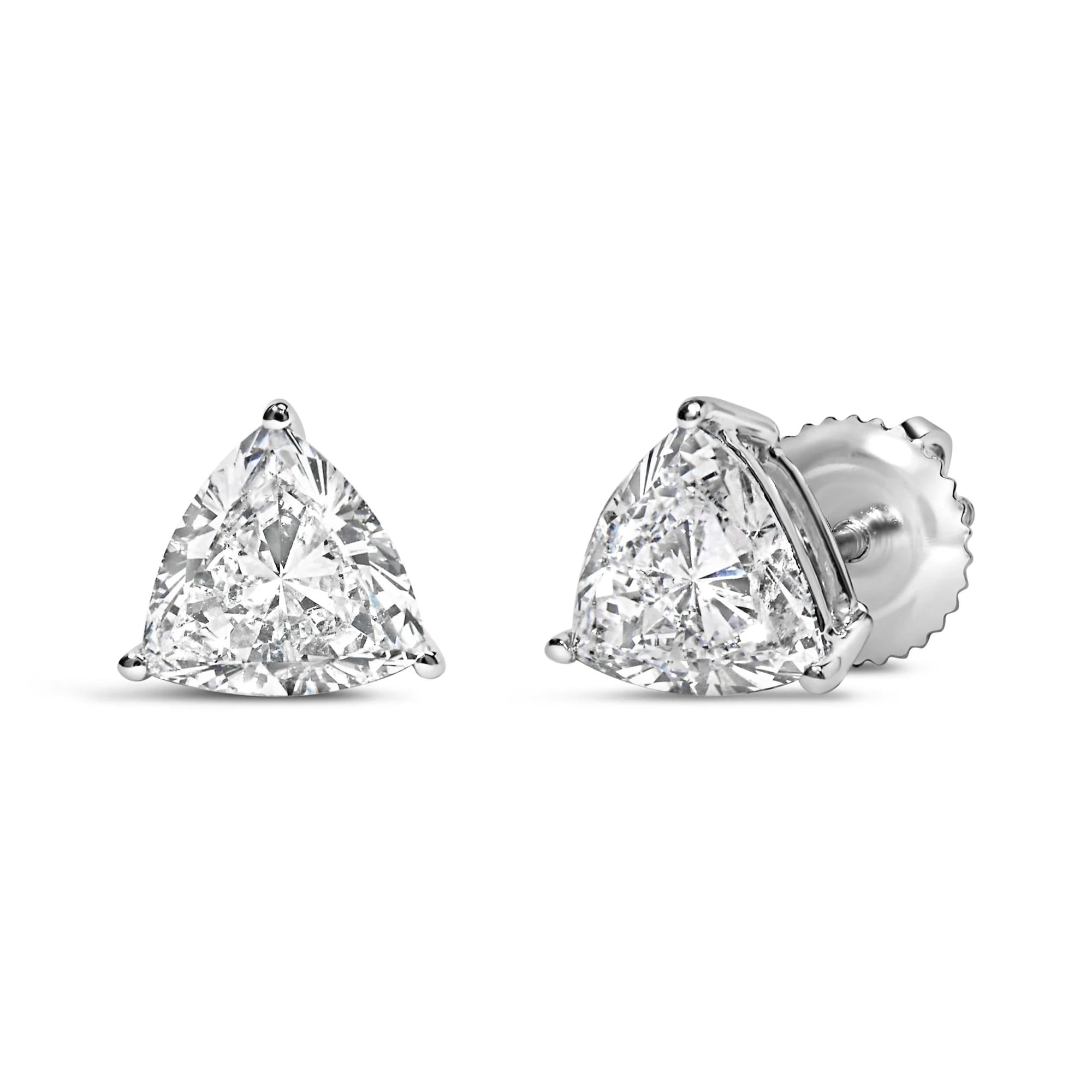 Discover the quintessence of brilliance and modern elegance with these exquisite stud earrings, each featuring a 1.0 carat trillion brilliant cut lab-grown diamond. These gems, ethically sourced to ensure both environmental and personal integrity, glitter with a mesmerizing F-G color and VS2-SI1 clarity, encapsulating sheer luxury. Set in sleek 14K white gold, the three-prong design not only secures the precious stones but enhances their unique triangular silhouette, allowing an exceptional catch of light that emphasizes their piercing clarity and spectacular sparkle. Designed for both sophistication and security, these earrings are equipped with robust screw-back closures, promising both comfort and durability for everyday wear.