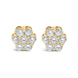 Discover the elegance of the 14K Yellow Gold Diamond Stud Earrings, exquisitely set with fourteen natural round brilliant cut diamonds, each blossoming into a captivating floral cluster that mimics the grandeur of a larger solitaire. Crafted from lustrous yellow gold, these earrings feature a total diamond weight of 3/4 carats, with each stone meticulously chosen for its I-J color and SI2-I1 clarity, ensuring a dazzling display of fire and brilliance. The shared prong setting not only enhances the sparkle but also emphasizes the floral motif, making these earrings a timeless addition to any ensemble. Designed for both security and comfort, the screw-back mechanism ensures these treasures remain safely in place, perfect for life's most special occasions or everyday luxury. Embrace the sophistication and charm these studs will bring to your jewelry collection, elevating your style with a touch of floral elegance.