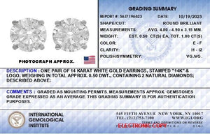 Immerse yourself in the elegance of these IGI certified diamond stud earrings, exquisitely crafted from 14K white gold enhanced with rhodium plating for added brilliance and durability. Each earring showcases a dazzling brilliant round-cut diamond, securely held in place by a timeless 4-prong setting that not only ensures stability but also maximizes the stoneâs visible surface area, allowing light to dance beautifully across its facets. These natural, earth-mined gems boast an impressive E-F color and I1-I2 clarity, radiating a clear, almost colorless splendor that is sure to capture the eye. Designed for daily sophistication or spectacular evening wear, the push-back closures provide both comfort and security. Elevate your jewelry collection with these radiant symbols of purity and excellence, perfect for any occasion or as a treasured gift.