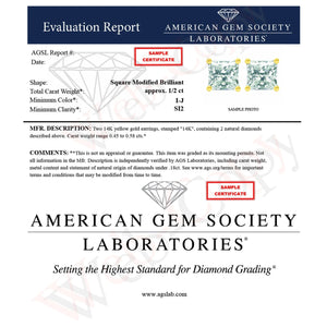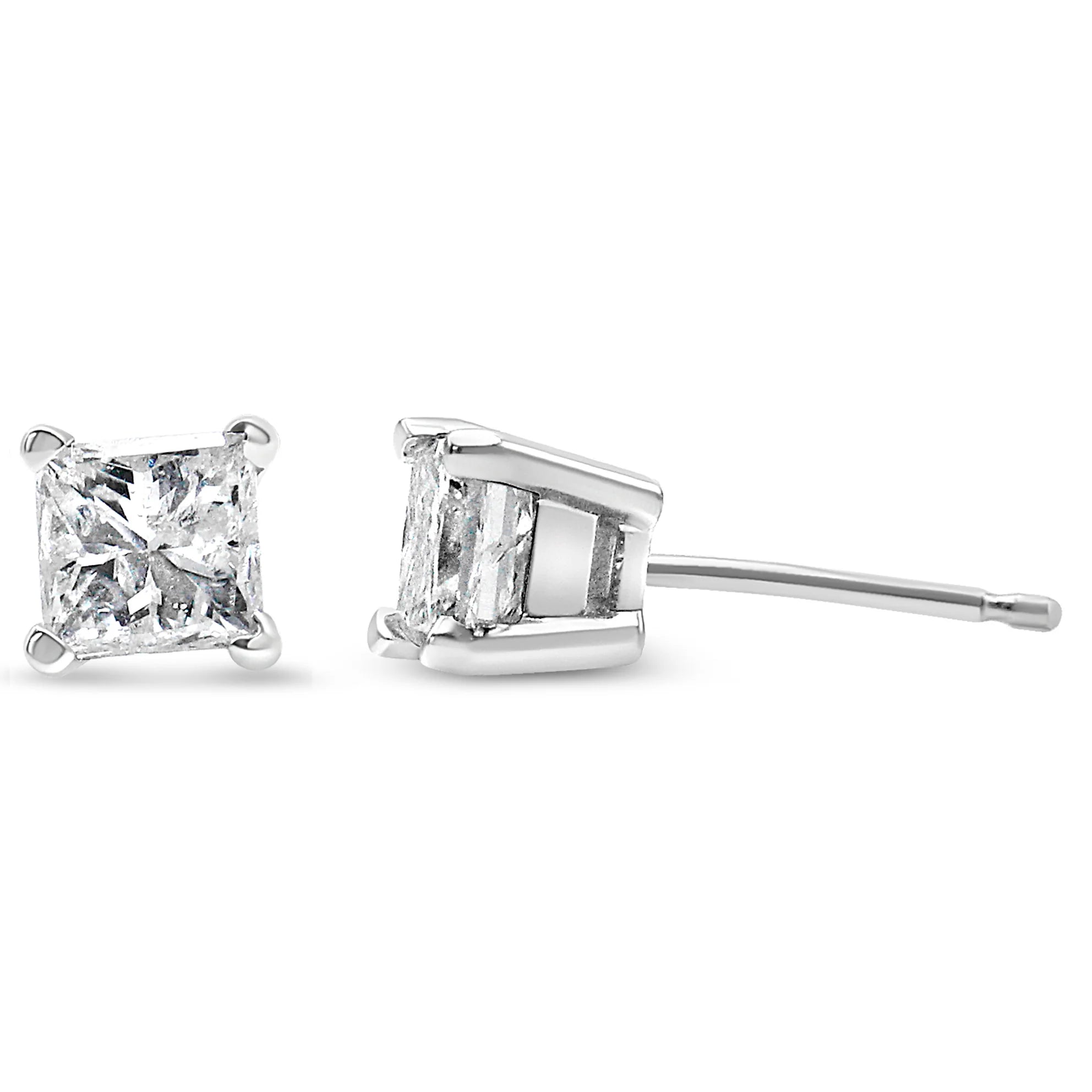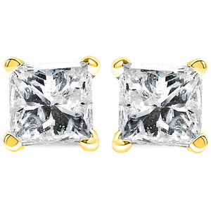 Celebrate any occasion with these classic shimmering diamond stud earrings. Crafted from 14k Yellow Gold each earring showcases a sparkling Princess-Cut Solitaire Diamond in a 4-Prong Setting. Dazzling with 1/2 cttw of diamonds and a bright polished shine, these Push Back stud earrings secure comfortably on your ear. These diamond studs are certified by the AGS as natural, earth mined diamonds. These diamonds are color rated as I-J Color, and clarity graded as SI2-I1 Clarity. Make these classic diamond studs yours today. Comes as a pair. Each earring piece has a 1/4 cttw diamond and the total weight for this diamond stud pair is 1/2 cttw.