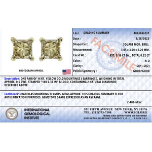 Introducing a captivating pair of earrings that exude timeless elegance and refined luxury. Crafted with utmost precision, these 14k yellow gold stud earrings feature a dazzling duo of princess-cut diamonds, each carefully set in a secure 4-prong setting. With a total weight of 1/3 carats, these sparkling gems effortlessly catch the light, radiating a mesmerizing brilliance. The IGI certification guarantees the authenticity and quality of these natural diamonds, boasting a stunning N-O color and SI1-SI2 clarity. Designed for women who appreciate sophistication and grace, these solitaire diamond earrings are the epitome of understated beauty. Completed with push back findings, these earrings ensure a comfortable and secure fit. Indulge in the allure of these princess-cut diamond stud earrings, a perfect accessory for any occasion.