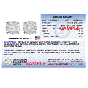 Embrace timeless elegance with these IGI-certified 14K white gold stud earrings, each cradling a brilliant round-cut natural diamond that radiates with an inner fire. With a combined total weight of 1.0 cttw, these resplendent gems boast a pristine G-H color and I1-I2 clarity, encapsulating clarity and a subtle hue that captivates and enchants. The formidable 4-prong setting ensures each diamond is held securely, reflecting every speck of light in a dazzling display of brilliance. Rhodium-plating enhances the white gold's resilience and shine, making these earrings not only a statement of luxury but also a testament to enduring craftsmanship. The push-back closure provides a comfortable and secure fit, perfect for life's everyday moments and special occasions alike. An embodiment of sophistication, these earrings promise to be a treasured addition to any jewelry collection, offering a sparkle that transcends trends and time.