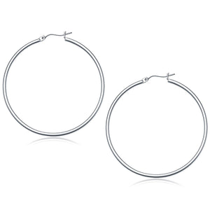 These timeless hoop earrings crafted in 10k white gold and measure 50 millimeters in diameter, featuring a snap lock backing.