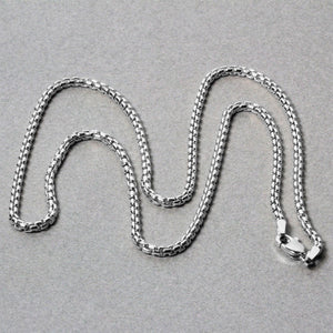 This round box chain comes in 14k white gold and has a width of 2.5 millimeters.