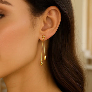 Glistening teardrops of gold swing and sway from the long and lovely lengths of serpentine snake chain in these dramatic long double drop earrings. Anchored with a polished ball stud, push back closures keep them secure.
