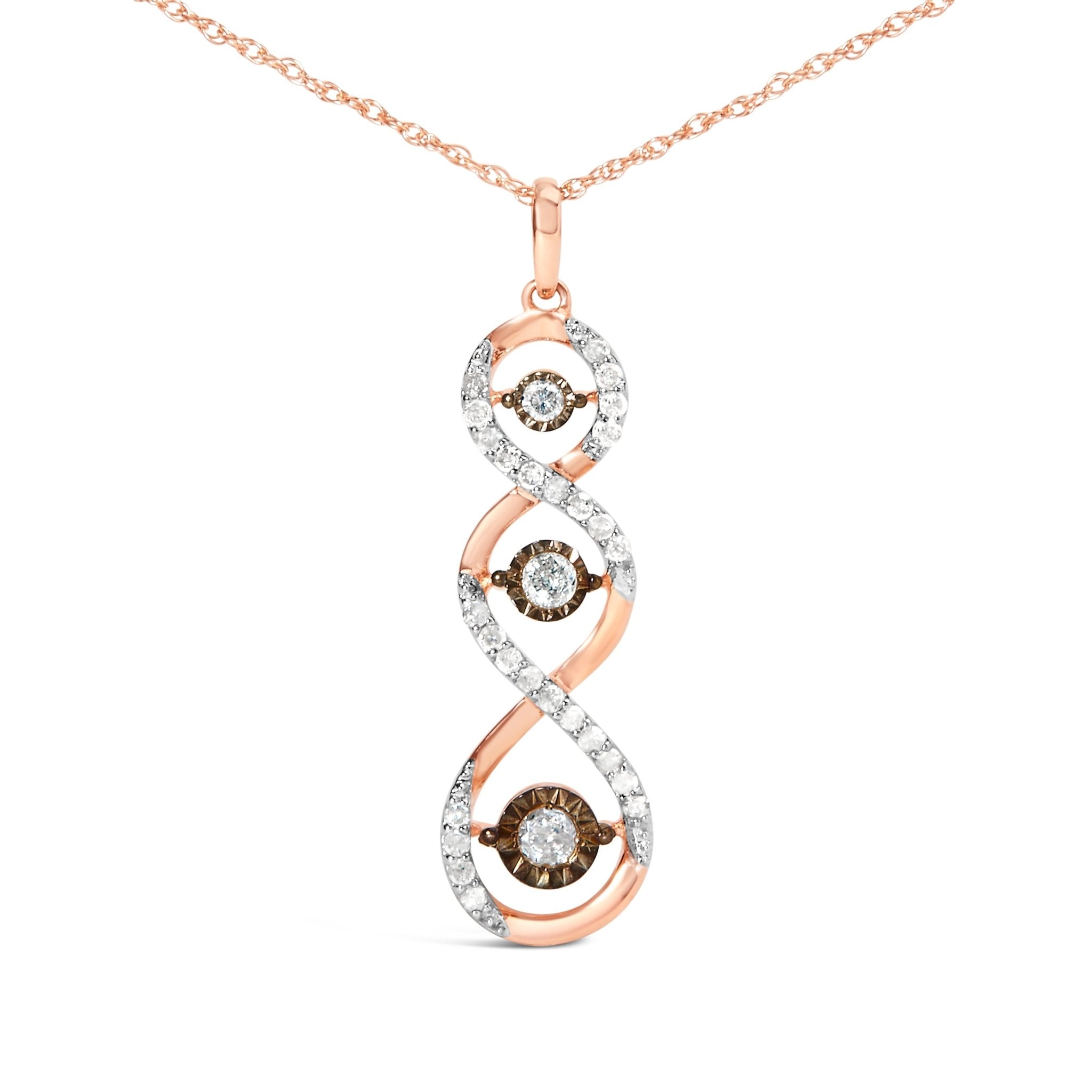 Indulge in the captivating beauty of this stunning pendant necklace, a true masterpiece of artistry and elegance. Crafted from 10K two toned gold plated .925 sterling silver, this necklace boasts a twisted design that will leave you spellbound. Adorned with 30 natural round-cut diamonds, including 3 champagne diamonds and 27 J-K diamonds and I2-I3 clarity, totaling 1/2 cttw, this necklace shimmers with a brilliant sparkle that will light up any room. The diamonds are set in a combination of miracle and prong settings, creating a mesmerizing effect that is simply breathtaking. The rope chain adds the perfect finishing touch to this magnificent necklace, which is secured with a spring ring clasp. Whether you're dressing up for a formal occasion or adding a touch of glamour to your everyday attire, this necklace is the perfect choice.