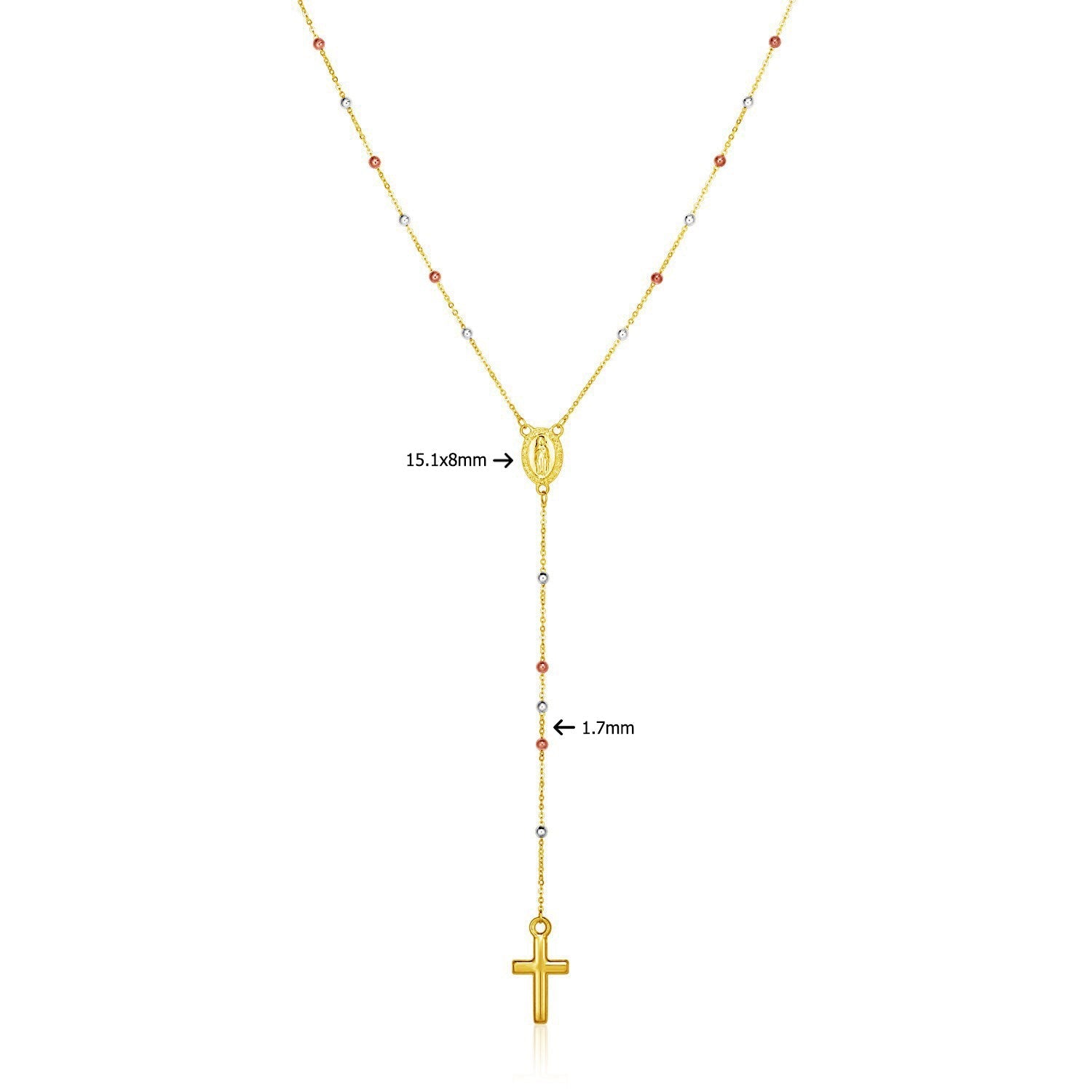 This stunning rosary necklace features a polished 14k gold cross and polished beads of 14K yellow, white, and rose gold, beautifully reminding all of the importance of faith. Necklace is 26 inches long.