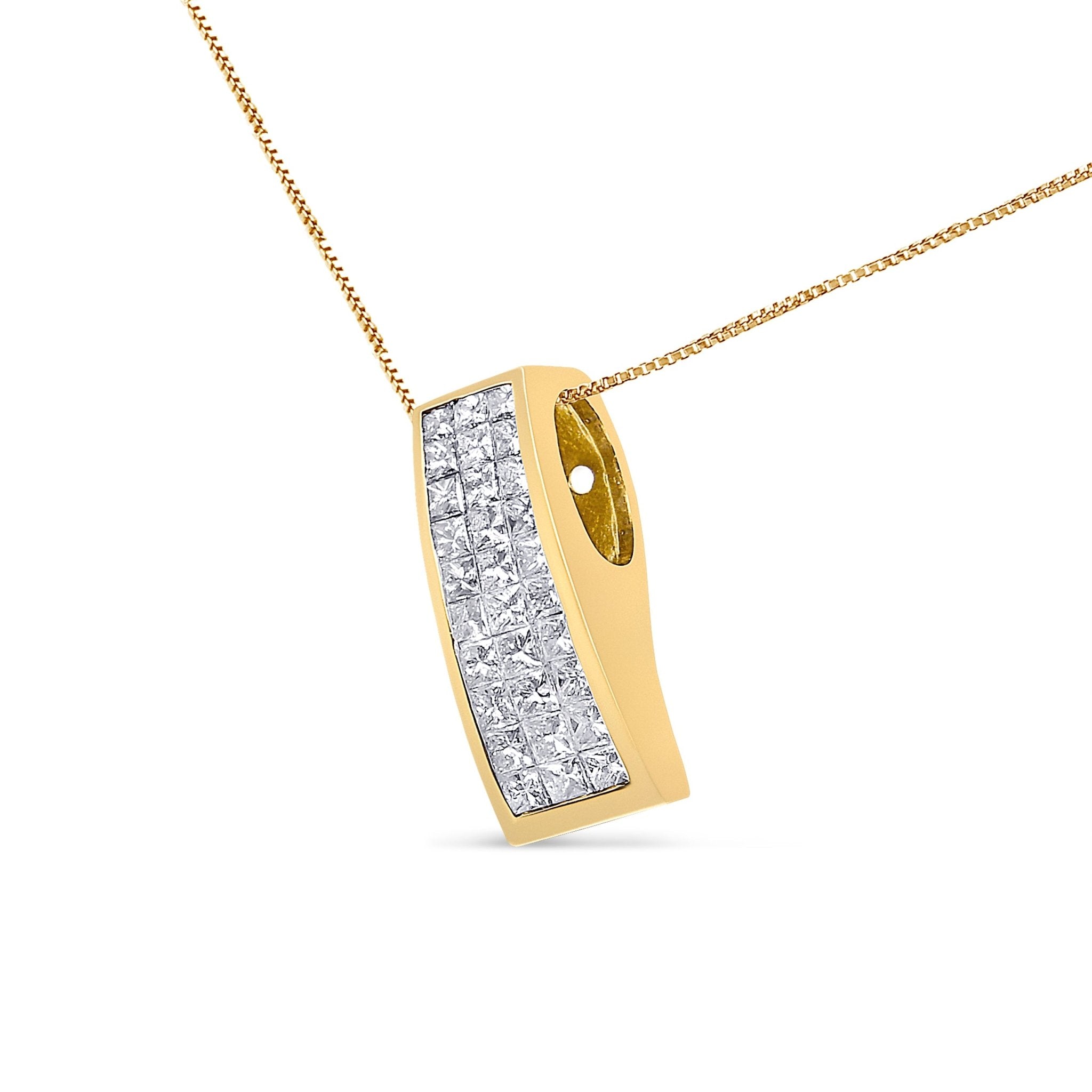 This radiant column-shaped pendant is adorned with 1 1/2 carats of princess cut diamonds for truly brilliant style. Set in 14 karat yellow gold, it's a piece that always gets noticed.
