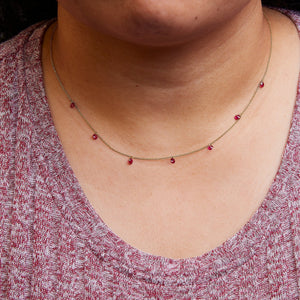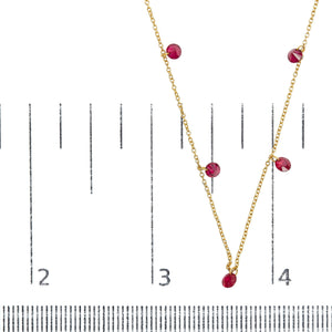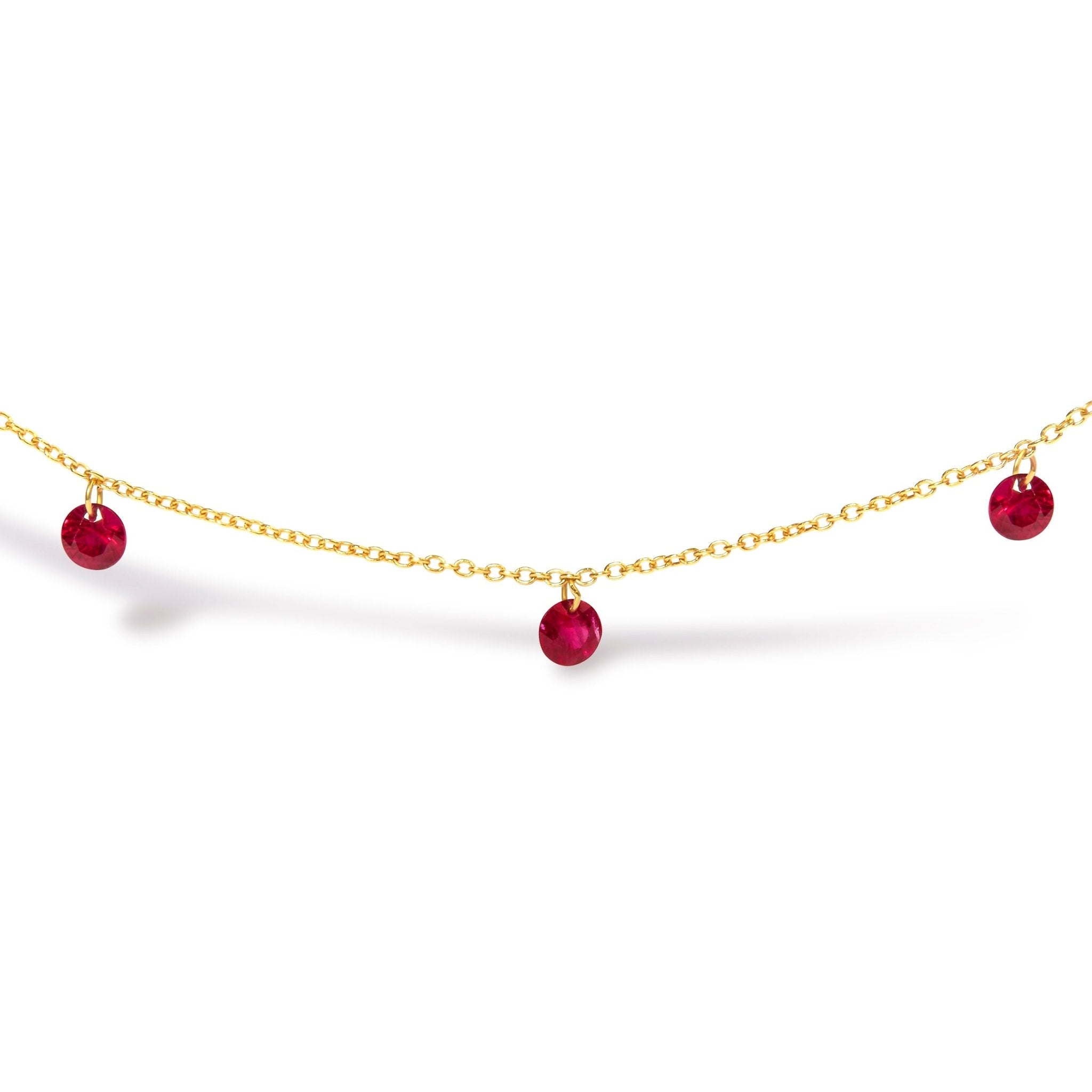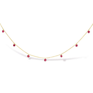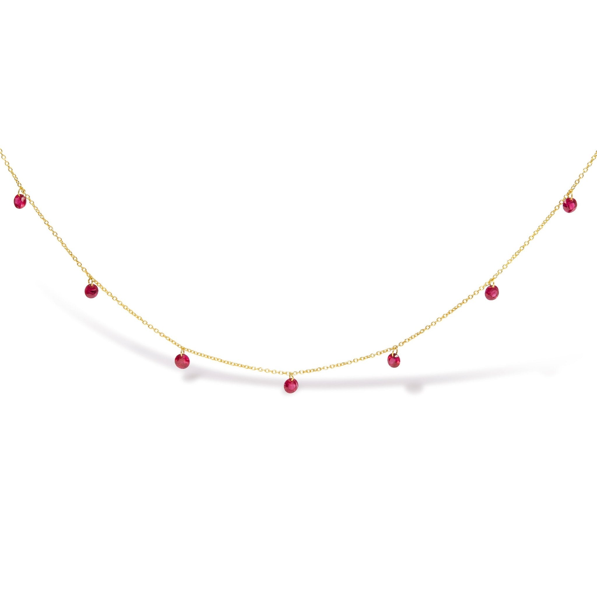 Indulge in timeless elegance with our exquisite 18K Yellow Gold Necklace adorned with a captivating 1 1/3 Cttw Dangling Ruby Drop. Crafted from luxurious 18K yellow gold, this collar necklace is a true statement piece, perfect for the modern woman who appreciates sophistication and style. The necklace features seven natural round rubies, each measuring 3.5 x 3.5 mm, and treated to enhance their vibrant red color. The rubies are expertly drilled and set to create a stunning dangling drop effect, adding movement and allure to the necklace. The lobster claw clasp ensures a secure and comfortable fit, while the 18-inch chain sits elegantly around the neck. Elevate your look with the enchanting beauty of rubies, exuding a timeless charm and capturing attention with every wear.