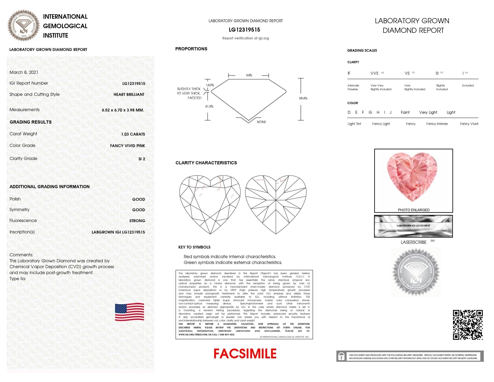 An elegant heart-shaped diamond is the brilliant focal point of this solitaire necklace for her. Set in 14K white gold, this stunning, pink lab grown diamond suspends from an 18-inch box chain that secures with a spring ring. The diamond is masterfully set in a 3 prong, martini setting for maximum dazzle. The simplicity of a perfect diamond will outlast every other piece you own. A brilliantly cut heart shaped diamond emanates pure elegance and love in its gold setting. Goes with anything you care to pair it with – another reason why you'll never want to take this one off. This sweet necklace makes a perfect Valentine's Day gift, or as a way to remember someone close to your heart. It's a classic and feminine piece she'll want to show off every day.