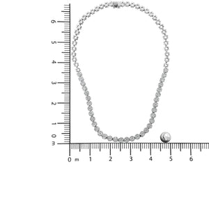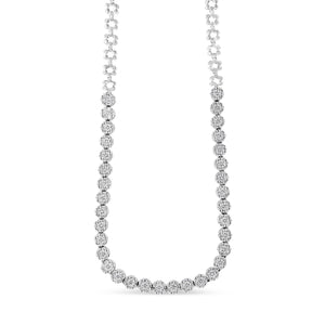 As elegant as it is dramatic, this dazzling Riviera diamond necklace elevates any attire. Expertly crafted in warm weaves of 14K white gold, this eye-catching design features flower-shaped clusters of shimmering round diamonds paired with polished gold beads, creating this bold and breathtaking design. This magnificent pieces features 34 links with 7, pave-set round diamonds per link for an eye popping total of 238 diamonds. Regal and radiant with 8 carats of round cut diamonds, this 18.0-inch necklace secures with a hidden box clasp with safety latch for a secured fit. This unique treasure comes with a certificate from the IGI for added assurance. The necklace ships out in beautiful packaging for easy gift giving.