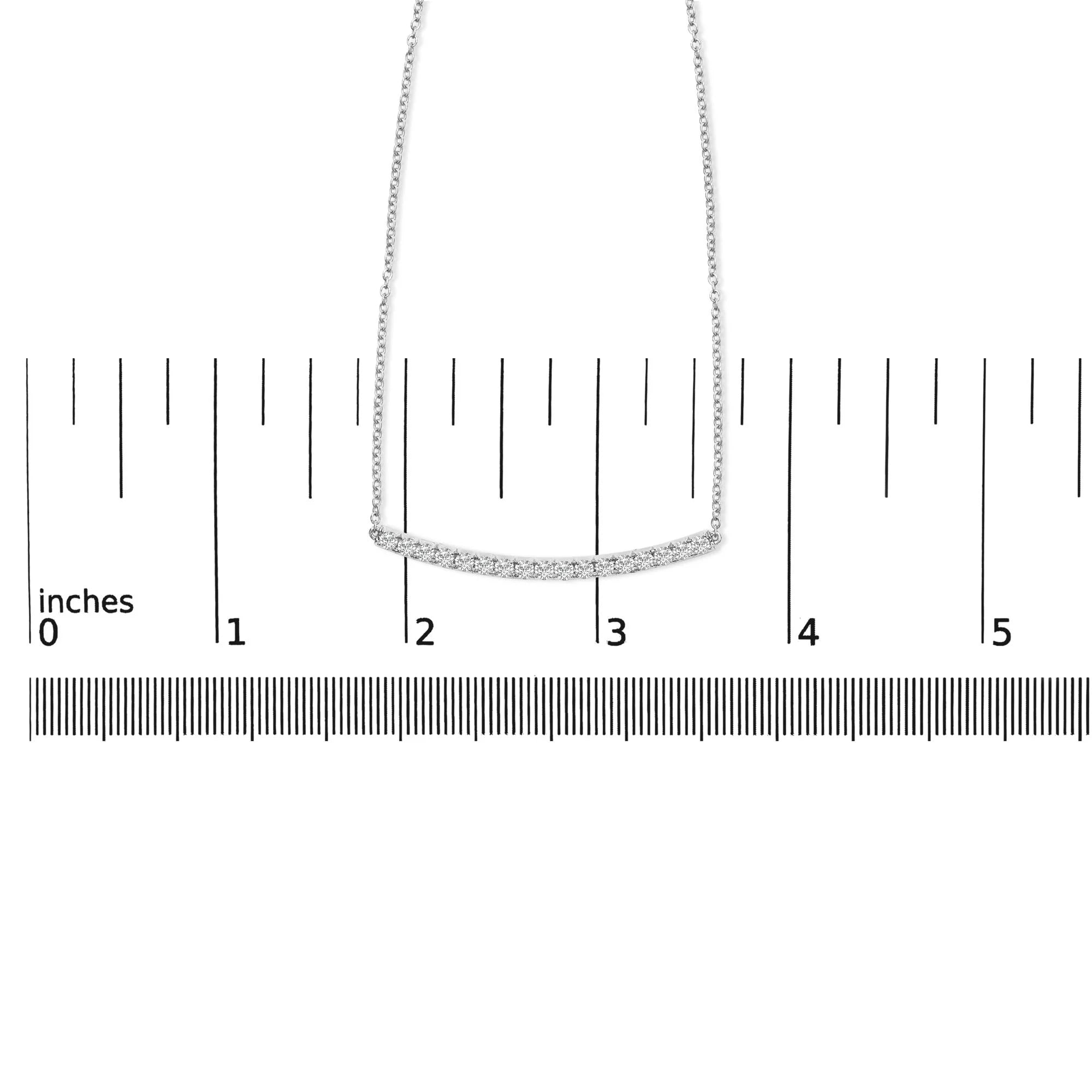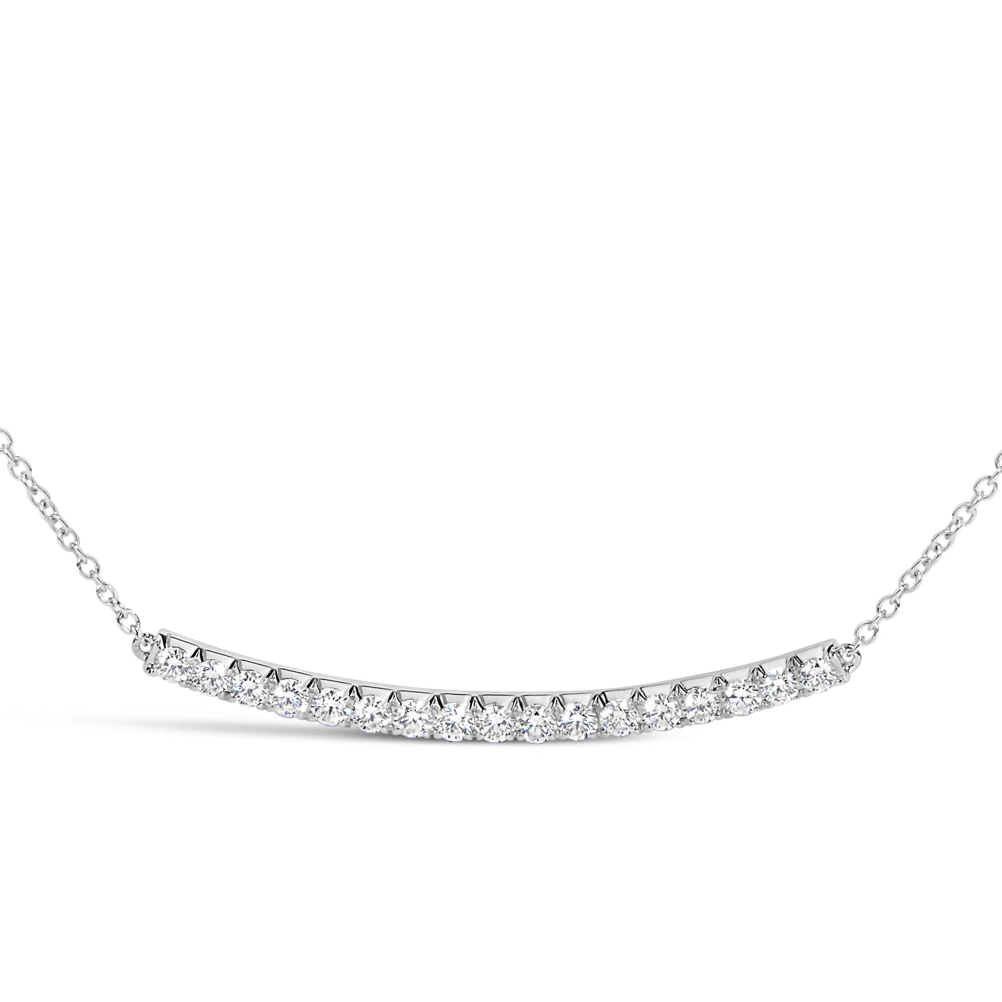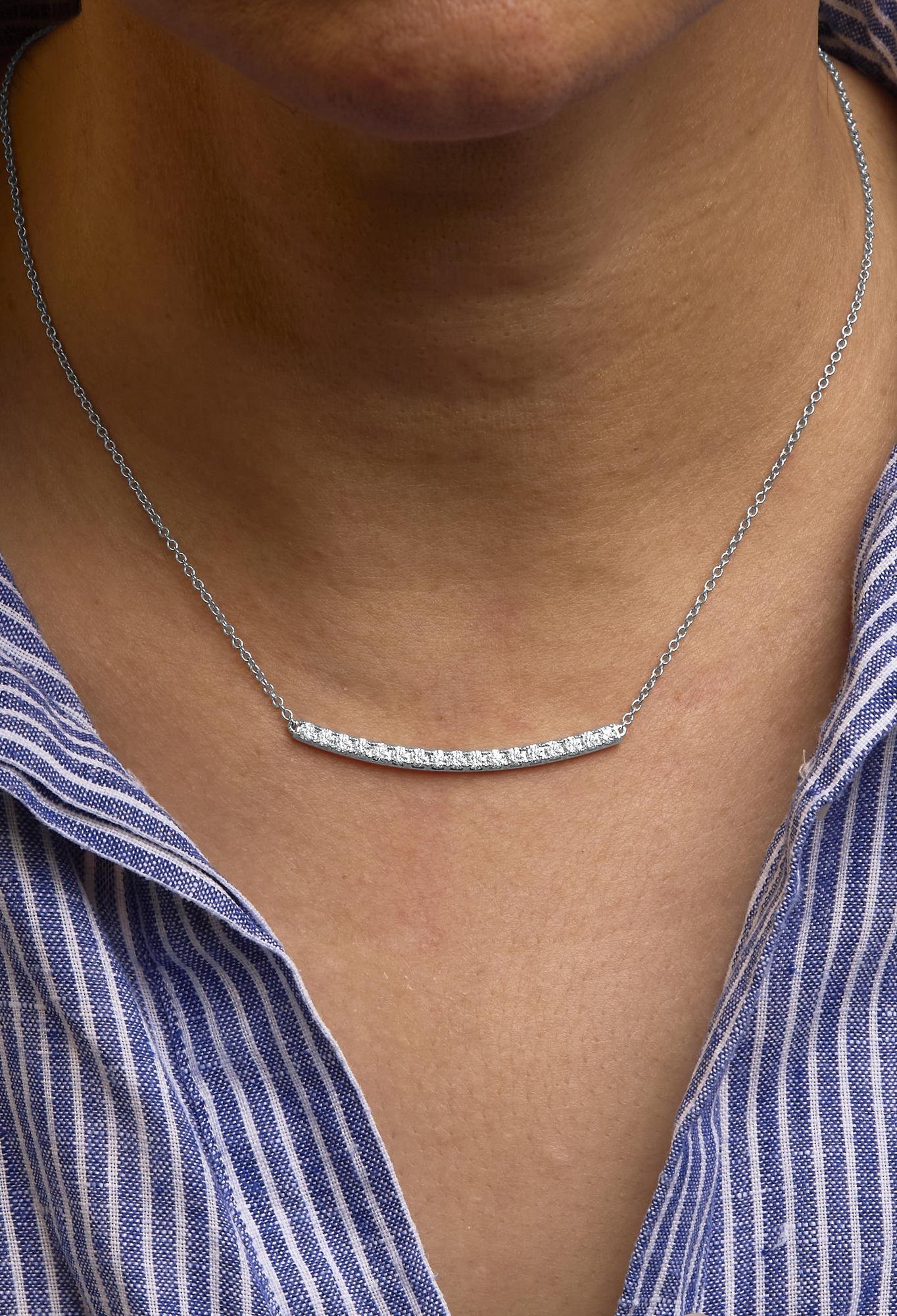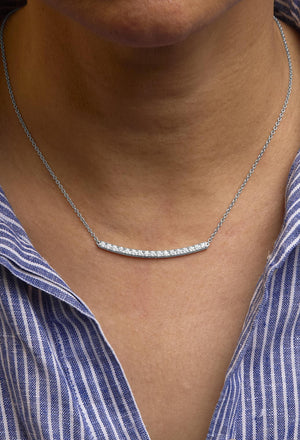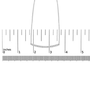 Immerse yourself in luxury with this exquisite 14K white gold curved bar pendant necklace, brilliantly adorned with 17 natural diamonds that collectively radiate a captivating sparkle. Each gem, meticulously four-prong set, boasts VS2-SI1 clarity and H-I color, ensuring an enchanting luster that catches the light with every movement. The elegant curve of the pendant, enhanced with a rhodium finish, gracefully adorns the neckline, complementing its wearer with an understated yet opulent charm. This 18-inch masterpiece hangs from a delicate cable chain, secured with a robust lobster claw clasp, promising both comfort and security. Perfectly suited for both special occasions and everyday elegance, this necklace isn't just a piece of jewelry but a testament to pristine craftsmanship and timeless style. White gold is plated with rhodium for extra luster.