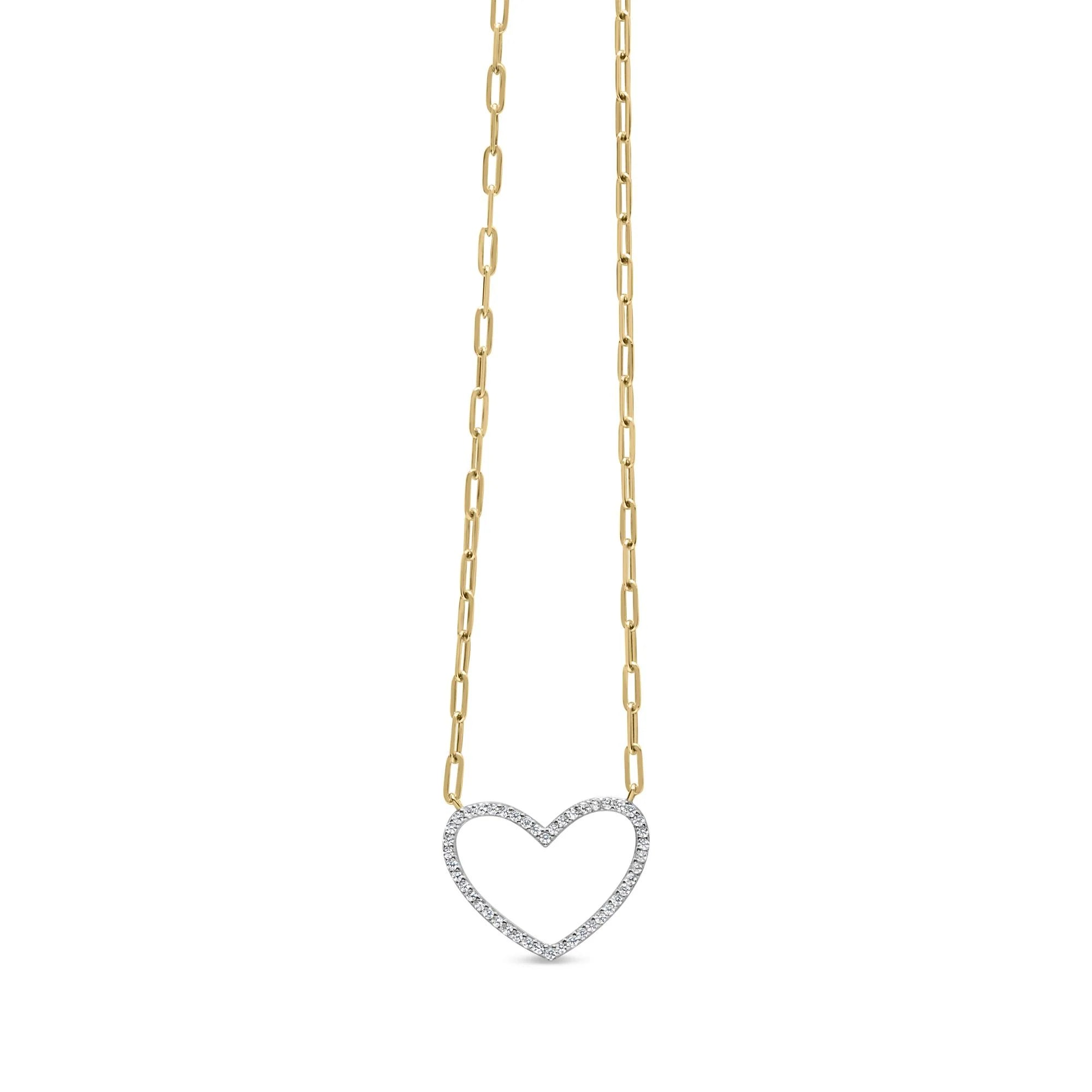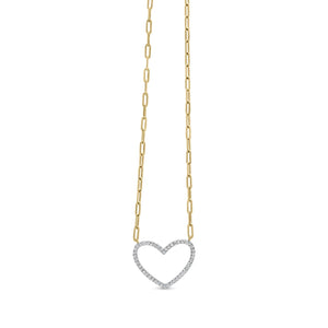 This exquisite necklace, crafted from .925 sterling silver with a radiant 14K yellow gold plating, presents a heart-shaped pendant that gracefully dances with the light, adorned with a quarter carat of natural diamonds. Each sparkling stone, carefully prong-set and highlighted with a touch of rhodium plating, celebrates clarity from I2 to I3 and a color range of I-J, enhancing the intricate heart's wondrous white gleam. Suspended from an 18-inch paperclip chain, this pendant embodies sophistication and love, clasped securely by a lobster claw, promising both comfort and durability. The open heart design not only symbolizes endless love but also adds a timeless elegance to any outfit, making it a perfect gift or a cherished keepsake.