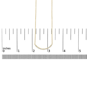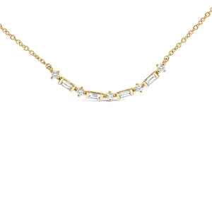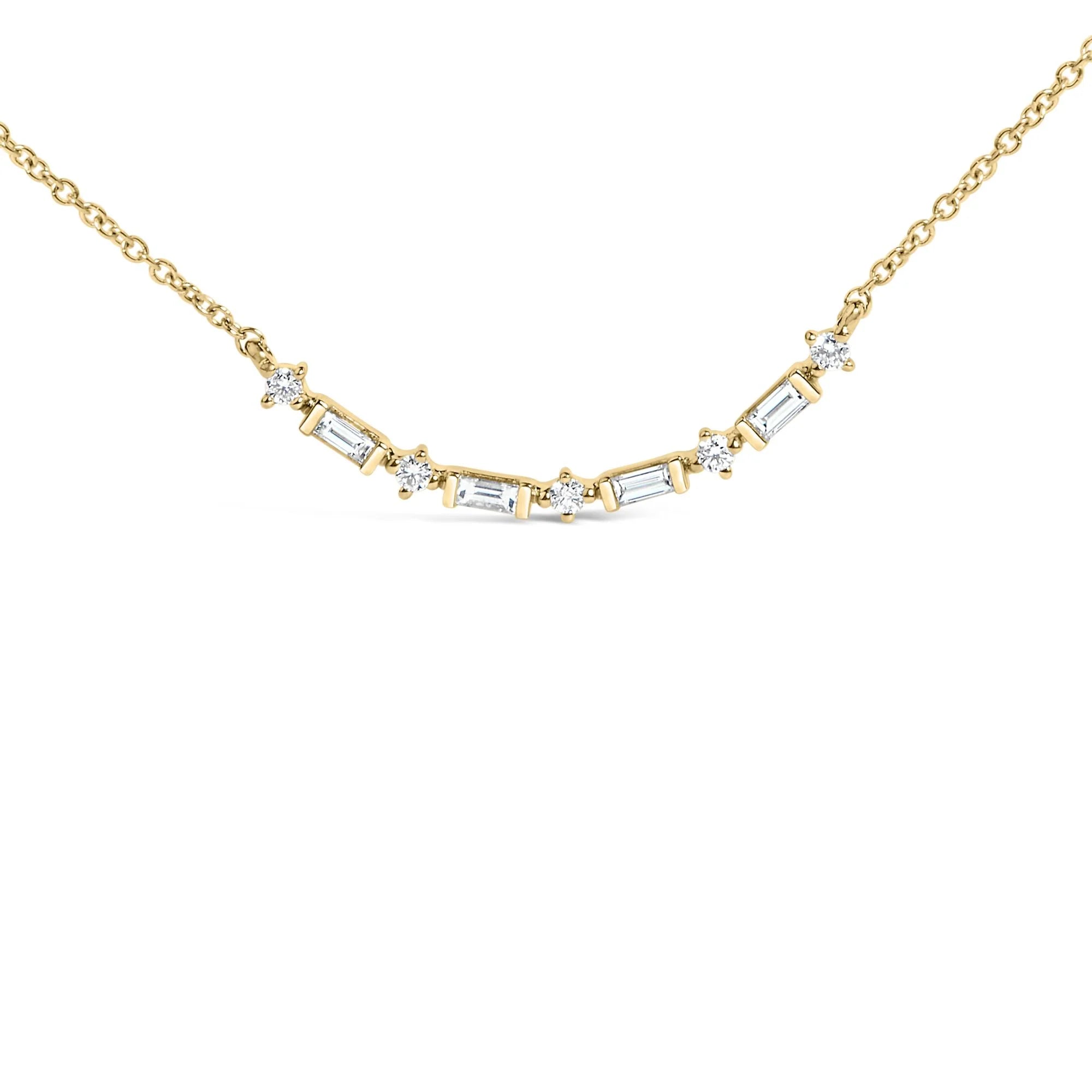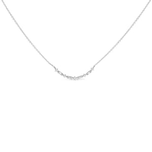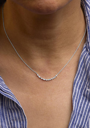 Embrace subtle luxury with our exquisite necklace, sculpted in solid 14K white gold. The pendant, a mesmerizing curve bar, is adorned with a quarter carat of natural diamonds that dance in unison, their round and baguette shapes alternating to catch rays of light from every angle. Each gem, boasting H-I color and VS2-SI1 clarity, is a treasure in itself, promising a sparkle that complements life's every occasion. Delicately perched on a fine 18-inch cable chain that lays just below the collarbone and secured by a robust lobster claw clasp, this piece provides not only comfort but also unyielding style. Ideal for those who covet timeless elegance and seek a splash of sophistication in their everyday. White Gold is rhodium plated.
