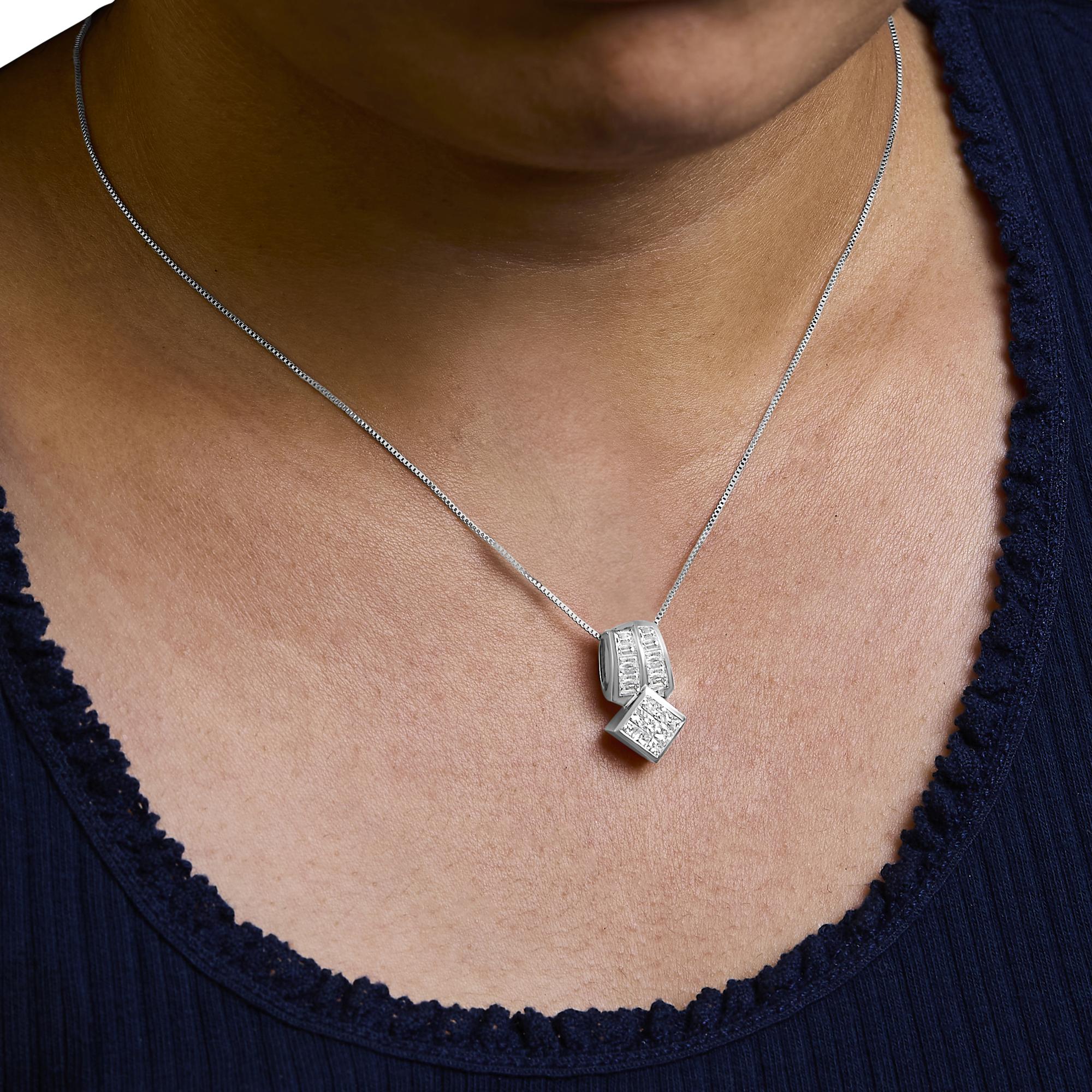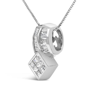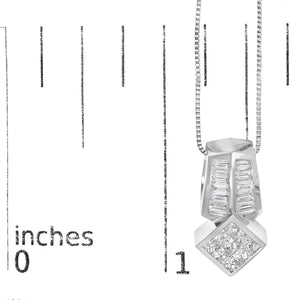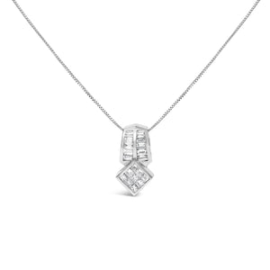 Immerse yourself in the resplendent beauty of this 14K white gold pendant necklace, where elegance meets precision. Bathed in a rhodium-plated finish, the necklace sparkles with an array of meticulously set diamonds, ensuring a glow that captures every gaze. The pendant features a harmonious blend of princess and baguette cut diamonds, totaling 1 1/2 carats, which dance with light in every movement. Each princess cut diamond is invisibly set, crafting the grand illusion of a singular, breathtaking solitaire, while the baguette diamonds are channel set, offering a rich tapestry of linear brilliance to the ensemble. Hung from an 18-inch box chain secured with a reliable spring-ring clasp, this piece promises not just opulence but also comfort and durability. Enrich your jewelry collection with this timeless piece, where every natural diamond tells a story of purity and sophistication in G-H color and VS1-VS2 clarity, destined to be cherished for generations.