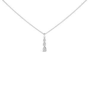 Elevate your elegance with this exquisite 14K white gold pendant necklace, designed to dazzle and charm with its unique drop style. Three graduating faux-pear settings, ingeniously pieced together from two round, natural diamonds each, offer an innovative twist on classic sophistication. These gems, boasting a G-H color and VS2-SI1 clarity, cascade delicately, reflecting light with every subtle movement. Rhodium plating enhances the 18-inch cable chain with a radiant sheen, promising durability and brilliance. Secured by a dependable lobster claw clasp, this necklace isn't just a piece of jewelry but a testament to craftsmanship and timeless style, perfect for celebrating lifeâs special moments.