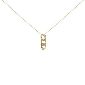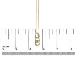 Discover the artistry and allure of this exquisite .925 sterling silver pendant necklace, plated in radiant 14K yellow gold. Its unique pendant boasts three interlocking, asymmetric circles, each meticulously adorned with natural diamonds that twinkle with an H-I color and I1-I2 clarity. These shimmering gems, set against the golden hue, evoke a celestial dance of light and shadow, capturing the essence of sophistication. Suspended on an elegant 18-inch box chain that fastens securely with a spring ring clasp, this necklace promises both glamour and comfort. Whether it's a cherished gift or a personal treasure, this captivating piece is a testament to your exquisite taste and the timeless beauty of expert craftsmanship.