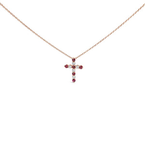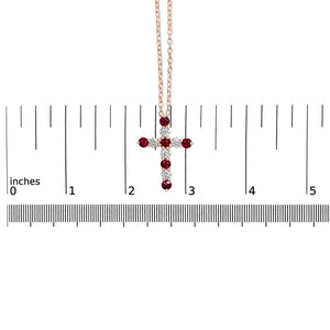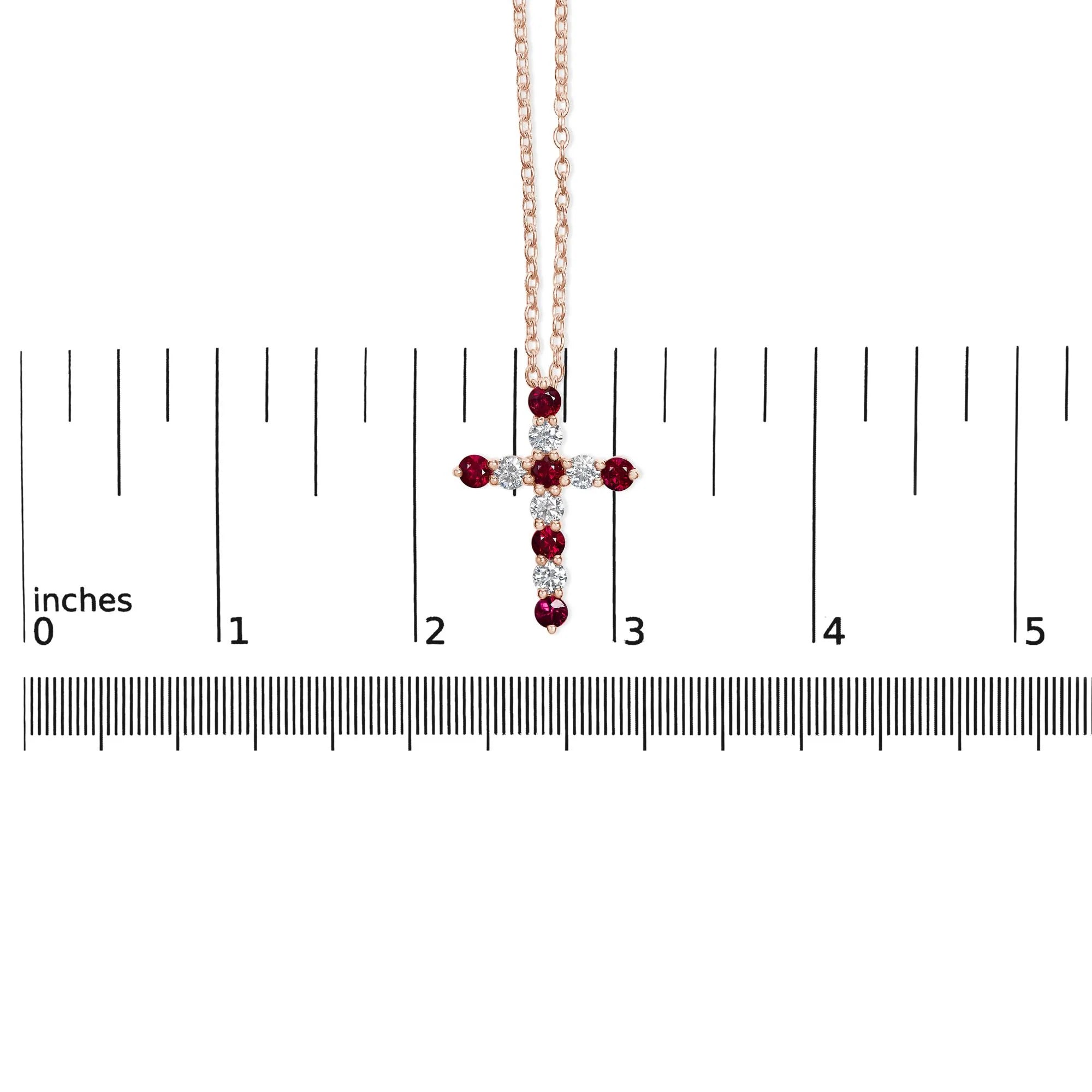 Introducing an exquisite blend of spirituality and luxury, this 18K rose gold necklace symbolizes both faith and opulence. Crafted with meticulous care, the necklace features a classic 18-inch cable chain with a lobster claw that provides a delicate canvas for the splendid cross pendant. The pendant is lovingly adorned with five round-cut diamonds and six vibrant round red rubies, each gemstone prong-set to perfection in alternating patterns, creating a striking contrast between the fiery rubies and the diamonds icy brilliance. Each diamond, boasting a color grade of F-G and clarity of VS2-SI1, harmonizes seamlessly with the natural, untreated rubies. Their combined half-carat weight captures light and attention alike, casting a captivating glow.