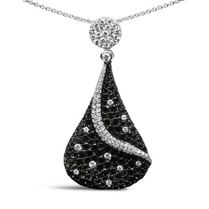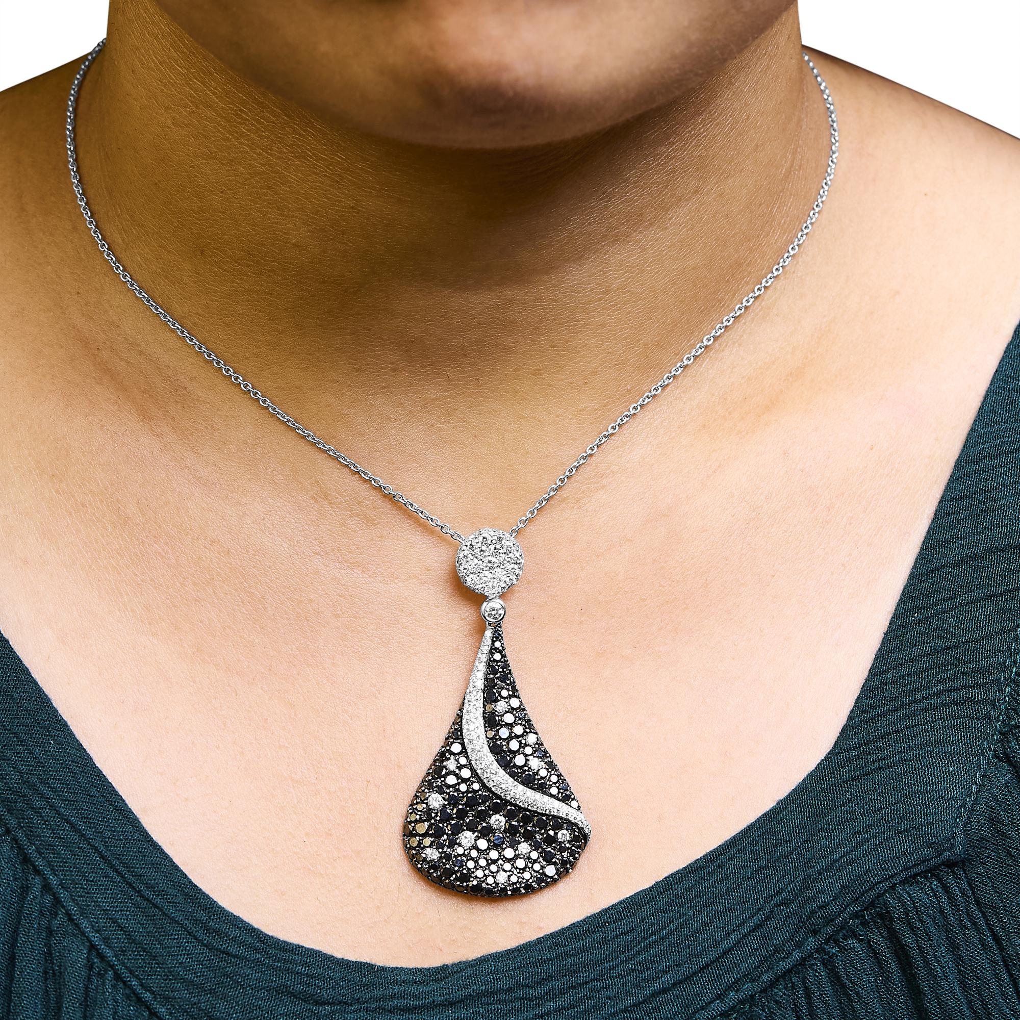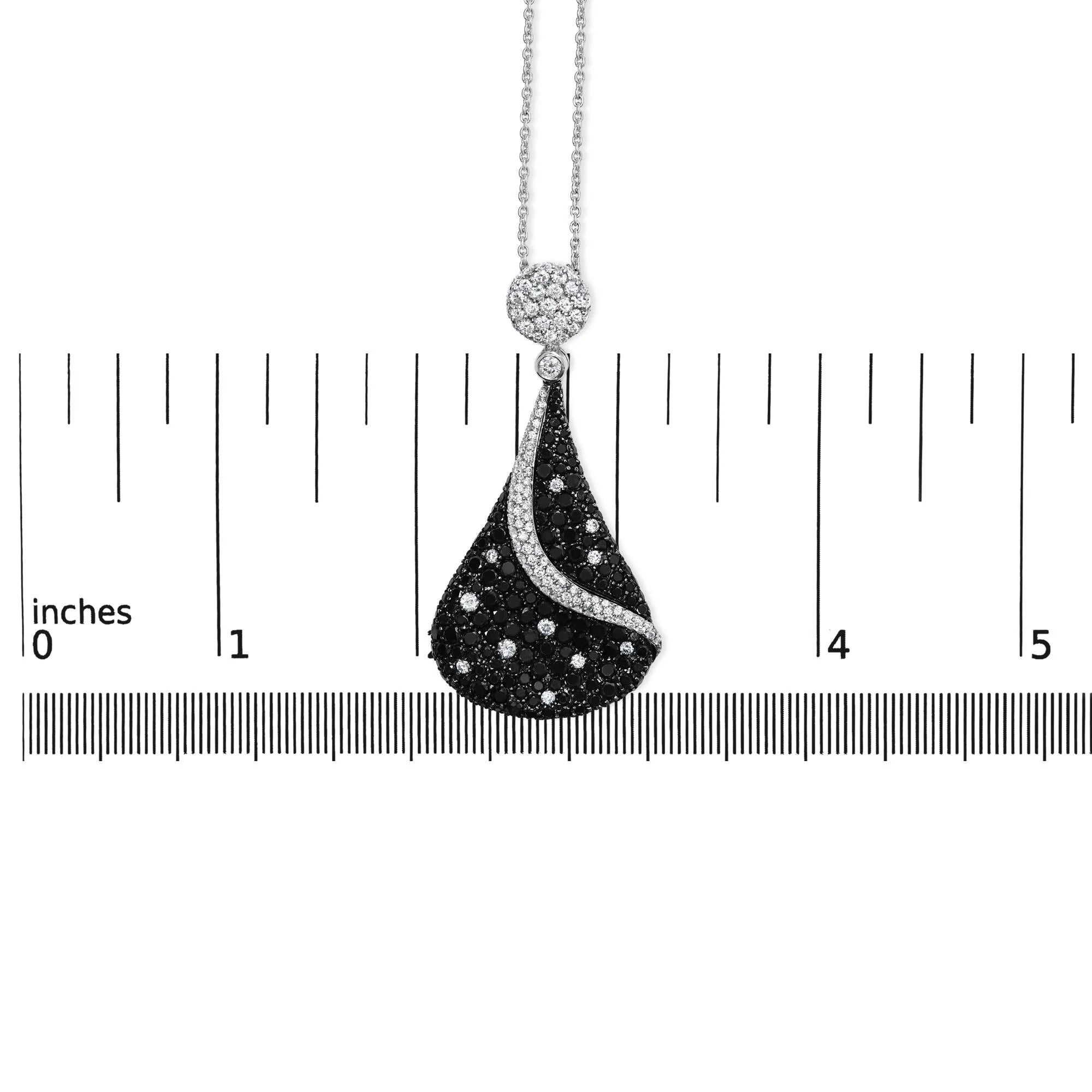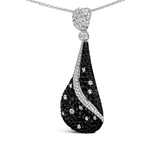 Immerse yourself in the opulence of the 18K White Gold Teardrop Pendant Necklace, where luxury meets a dynamic contrast of hues and artistry. This masterpiece, adorned with 6 1/3 carats of natural black and white diamonds, offers an enchanting dance of light and textures. Pave-set to perfection, the black diamonds are treated to deepen their allure against the sparkling, untreated white diamonds, F-G in color and VS1-VS2 in clarity, which gracefully curve and cluster at the bail for a sophisticated crescendo. Crafted in rhodium-plated white gold for added brilliance and durability, and suspended on an adjustable, elegant cable chain, this pendant promises not just an accessory but a personal emblem of elegance and refined taste. Chain ist adjustable from 16.5 to 17.5 inches.
