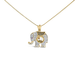 Imbued with the exotic charm of the majestic elephant, this elegant 18K yellow gold pendant necklace transcends mere adornment to become a captivating piece of wearable art. Crafted with precision, it sparkles intensely with 3/4 carats of natural white diamonds. The brilliance of the diamonds, featuring G-H color and VS2-SI1 clarity, is enhanced by a rhodium-plated pave setting. A robust glass container cradles a triad of color-treated gemstones: a fiery ruby, a verdant emerald, and a serene sapphire. These bezel-set jewels dance with every movement, embodying the spirited joy of this symbol of wisdom and strength. The pendant is suspended by a supple 18-inch yellow gold wheat chain, secured with a reliable spring ring clasp.